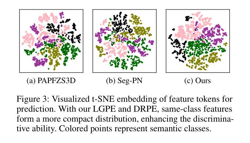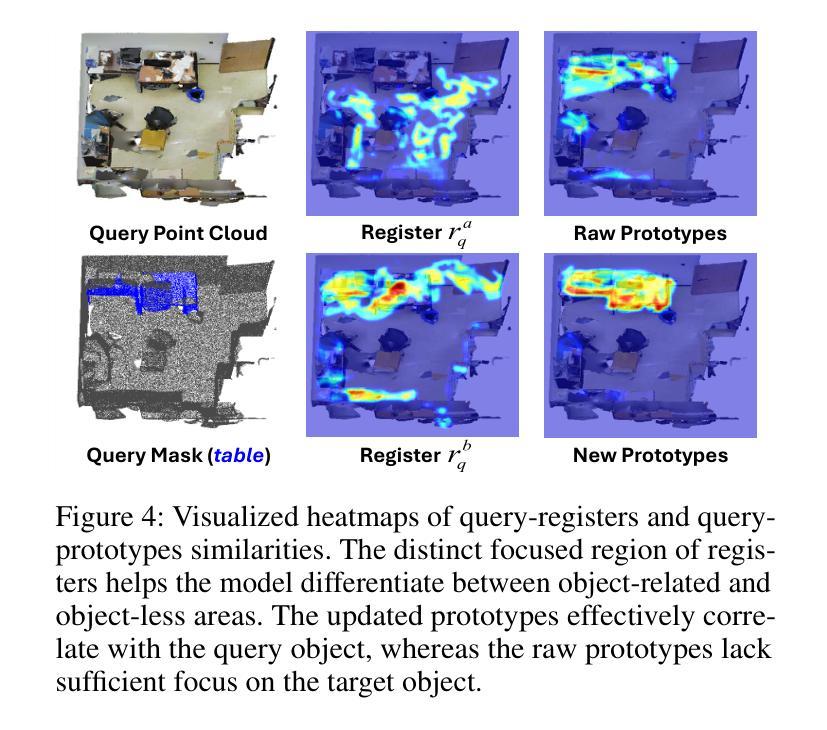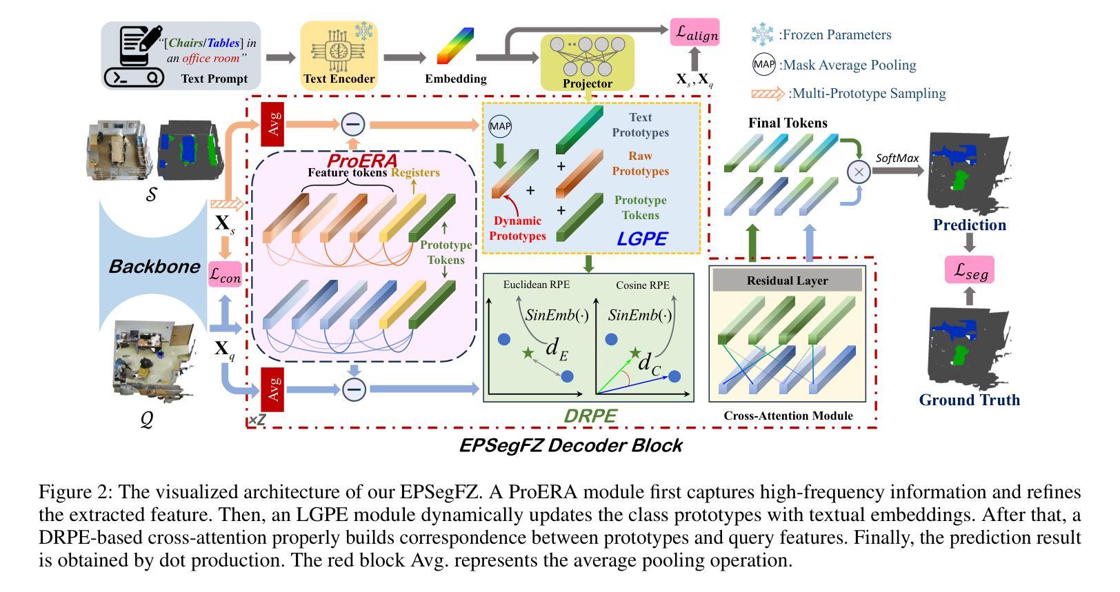 针对少样本3D点云语义分割的最新方法通常需要两阶段学习过程,即预训练阶段后跟少数样本训练阶段。虽然这些方法有效,但它们过于依赖预训练,阻碍了模型的灵活性和适应性。一些模型试图避免预训练,但未能捕获充足的信息。此外,当前的方法主要关注支持集中的视觉信息,而忽视或未充分利用其他有用数据,如文本注释。这种对支持信息的不充分利用影响了模型的性能,并限制了其零样本能力。为了解决这些局限性,我们提出了一种新型无预训练网络,名为“Efficient Point Cloud Semantic Segmentation for Few- and Zero-shot scenarios”(高效点云语义分割用于少样本和零样本场景)。我们的EPSegFZ包含三个关键组件。首先是Prototype-Enhanced Registers Attention(ProERA)模块和基于Dual Relative Positional Encoding(DRPE)的交叉注意力机制,用于改进特征提取和准确的查询原型对应关系的构建,无需预训练。其次是Language-Guided Prototype Embedding(LGPE)模块,该模块有效利用支持集中的文本信息,以提高少样本性能并实现零样本推理。大量实验表明,我们的方法在S3DIS和ScanNet基准测试上的表现优于最新方法,分别提高了5.68%和3.82%。
