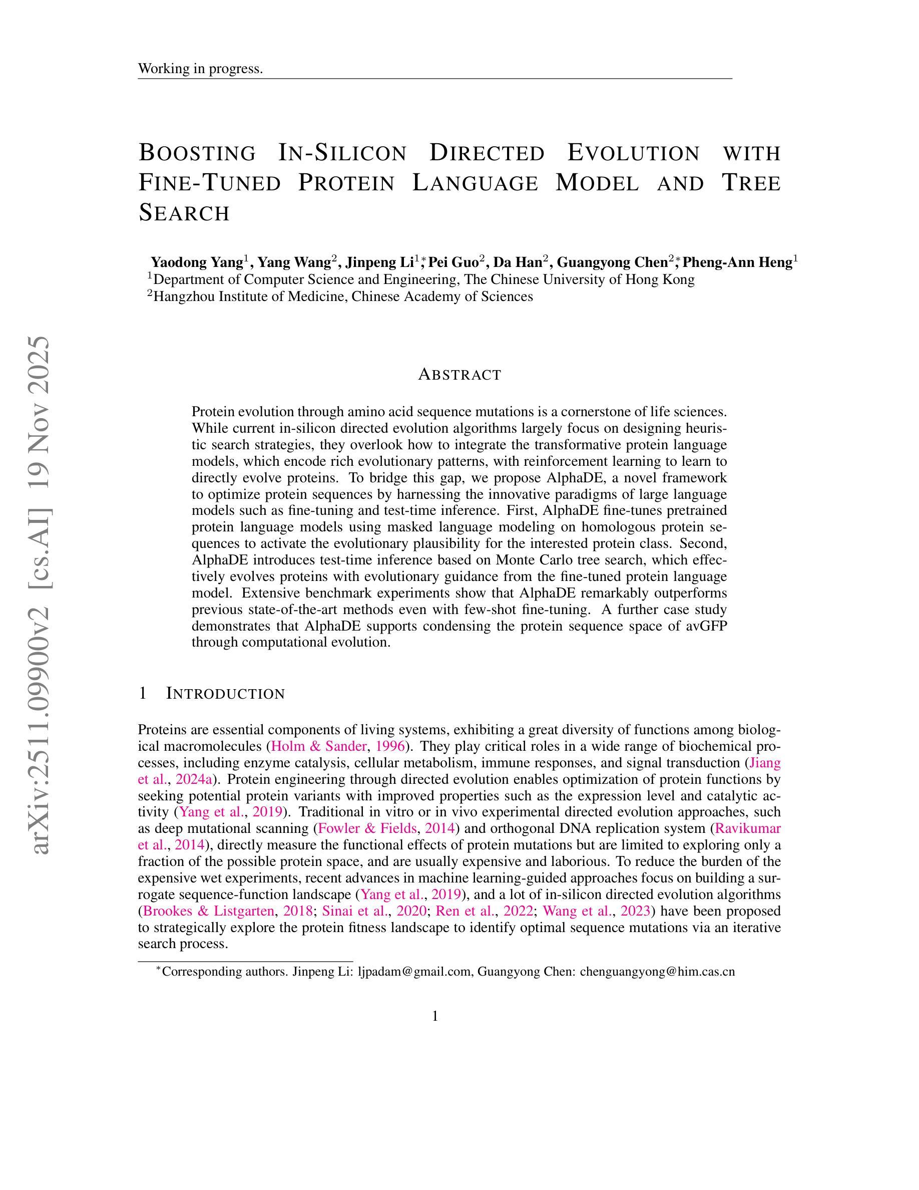 蛋白质序列通过氨基酸突变进化是生命科学的核心领域之一。当前基于芯片的定向进化算法主要关注启发式搜索策略的设计,忽视了如何整合富含进化模式的蛋白质语言模型与强化学习,以直接进化蛋白质。为了弥补这一空白,我们提出了AlphaDE这一新型框架,利用大型语言模型的精细调整与测试时间推断等创新理念来优化蛋白质序列。AlphaDE首先通过同源蛋白质序列的掩码语言建模对预训练的蛋白质语言模型进行微调,以激活目标蛋白质类别的进化可能性。然后,AlphaDE引入基于蒙特卡洛树搜索的测试时间推断,有效地在蛋白质语言模型的指导下进化蛋白质。基准测试实验表明,即使在微调样本量很少的情况下,AlphaDE也能显著超越当前最先进的算法。进一步的案例研究表明,AlphaDE支持通过计算进化凝聚avGFP的蛋白质序列空间。