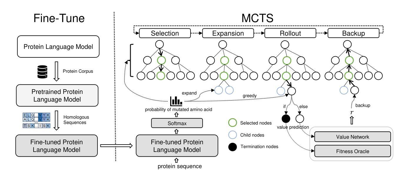 Boosting In-Silicon Directed Evolution with Fine-Tuned Protein Language Model and Tree Search
