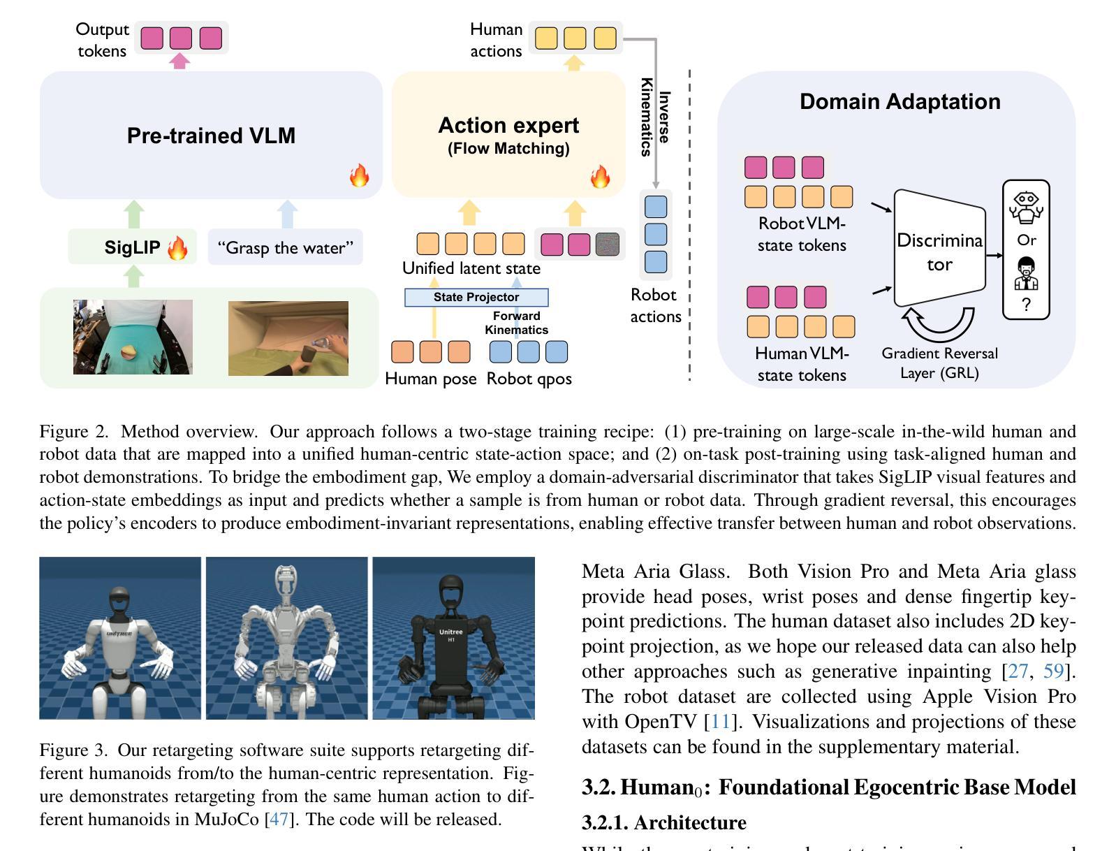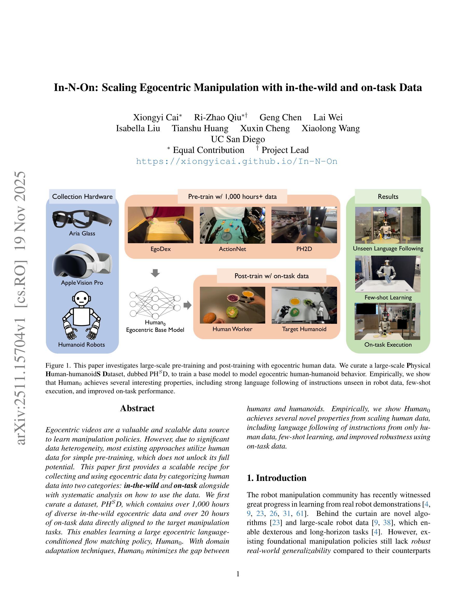 以自我为中心的视频是学习操作策略的有价值且可扩展的数据来源。然而,由于数据存在大量异质性,大多数现有方法仅使用人类数据进行简单预训练,这并没有充分发挥其全部潜力。本文首先通过将人数据分为两大类:野生数据和任务内数据,提供了一套收集和使用以自我为中心数据的可扩展方案,并进行了如何使用这些数据进行的系统分析。我们首先整理了一个数据集PHSD,其中包含超过1000小时的各种野生以自我为中心的数据和超过20小时直接与目标操作任务对齐的任务内数据。这使得我们能够学习一项大型的语言条件流匹配策略Human0。借助域适应技术,Human0缩小了人类与人形机器人的差距。从实证来看,我们展示了Human0通过扩展人类数据实现了若干新颖的特性,包括仅从人类数据中遵循指令的语言跟随能力、小样本学习能力和使用任务内数据提高的稳健性。项目网站地址为:https://xiongyicai.github.io/In-N-On/