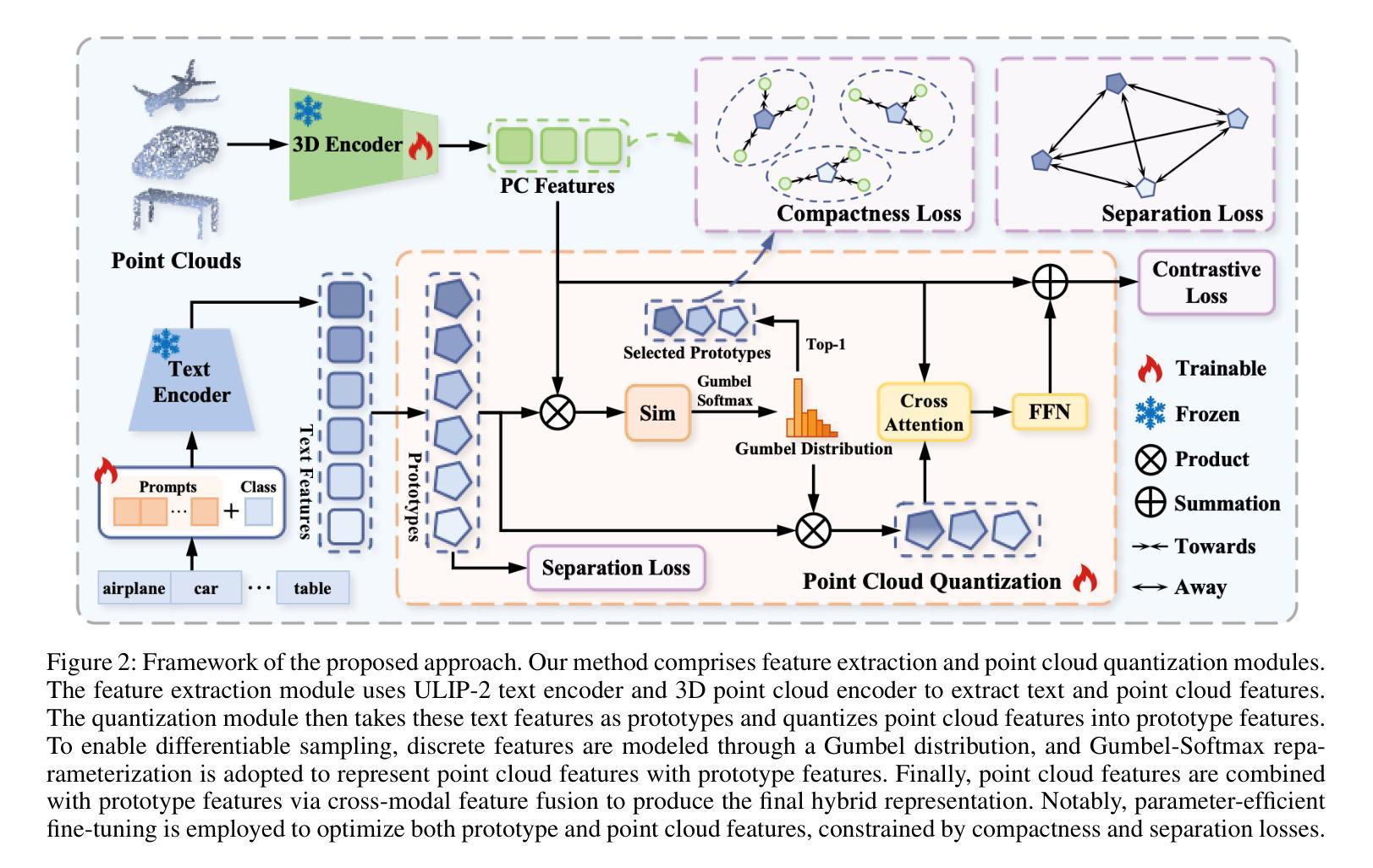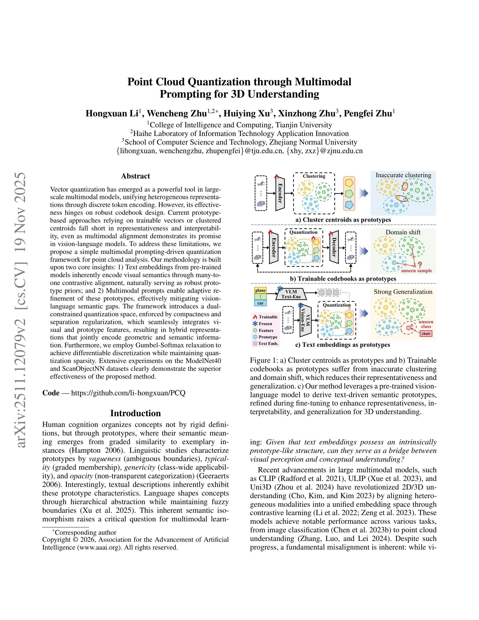 向量量化在多模态模型中展现出强大的实力,通过离散令牌编码统一了异质表示。本文提出一种简单、多模态提示驱动的点云分析量化框架,解决了现有原型基础方法代表性不足和解释性不强的问题。框架基于两大核心观点,即文本嵌入自然编码视觉语义作为稳健原型先验和多模态提示自适应优化这些原型。通过引入双约束量化空间,结合视觉和原型特征,形成混合表示,同时采用Gumbel-Softmax松弛实现可微分的离散化并保持量化稀疏性。在ModelNet40和ScanObjectNN数据集上的实验证明了该方法的有效性。