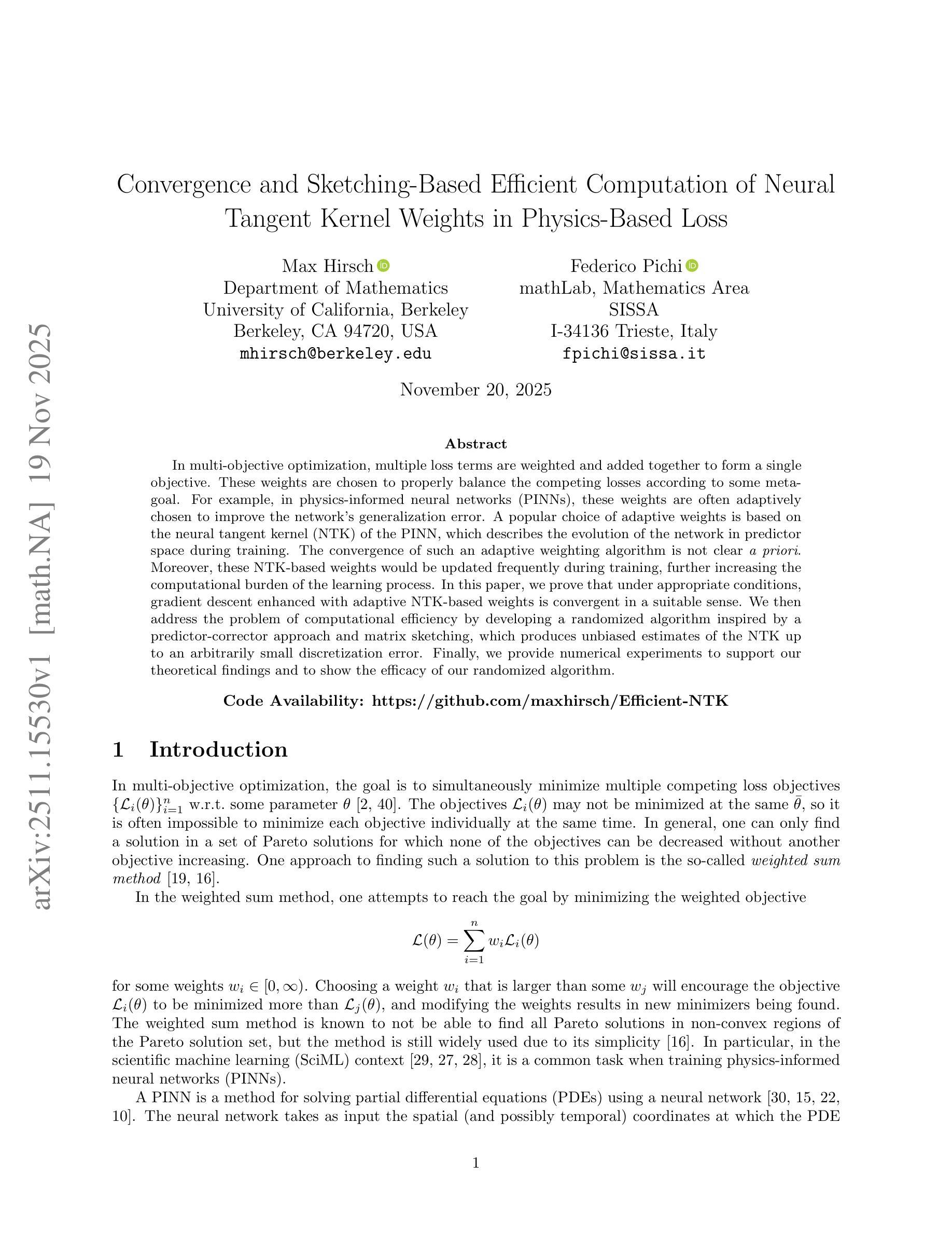 In multi-objective optimization, multiple loss terms are weighted and added together to form a single objective. These weights are chosen to properly balance the competing losses according to some meta-goal. For example, in physics-informed neural networks (PINNs), these weights are often adaptively chosen to improve the network’s generalization error. A popular choice of adaptive weights is based on the neural tangent kernel (NTK) of the PINN, which describes the evolution of the network in predictor space during training. The convergence of such an adaptive weighting algorithm is not clear a priori. Moreover, these NTK-based weights would be updated frequently during training, further increasing the computational burden of the learning process. In this paper, we prove that under appropriate conditions, gradient descent enhanced with adaptive NTK-based weights is convergent in a suitable sense. We then address the problem of computational efficiency by developing a randomized algorithm inspired by a predictor-corrector approach and matrix sketching, which produces unbiased estimates of the NTK up to an arbitrarily small discretization error. Finally, we provide numerical experiments to support our theoretical findings and to show the efficacy of our randomized algorithm. Code Availability: https://github.com/maxhirsch/Efficient-NTK