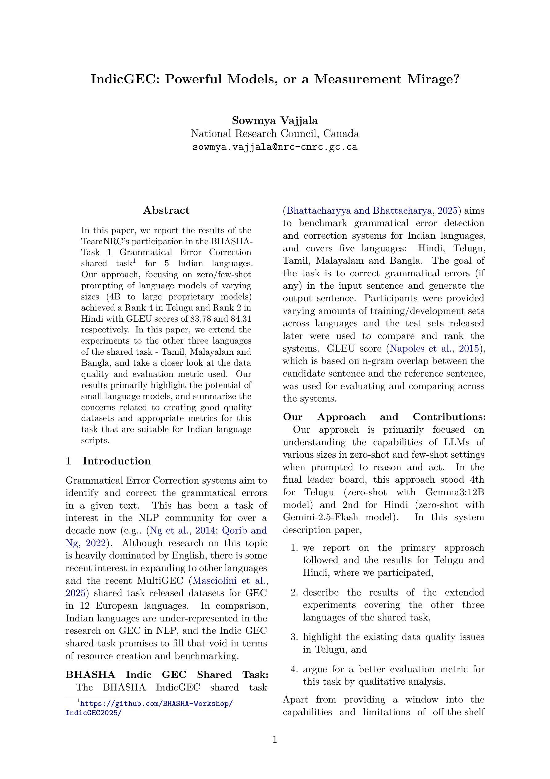 本文报道了TeamNRC参与BHASHA-Task 1语法错误修正共享任务的结果。我们采用的方法侧重于对各种规模的模型(从4B到大型专有模型)进行零次或多次提示,在泰卢固语和印地语中分别以GLEU得分83.78和84.31的成绩排名第4和第2。在这篇论文中,我们将实验扩展到共享任务中的其他三种语言——泰米尔语、马拉雅拉姆语和孟加拉语,并仔细观察了数据质量和所使用的评估指标。我们的结果主要强调了小型语言模型的潜力,并总结了创建高质量数据集和适合印度语言脚本的相关任务的适当指标所存在的相关问题和担忧。