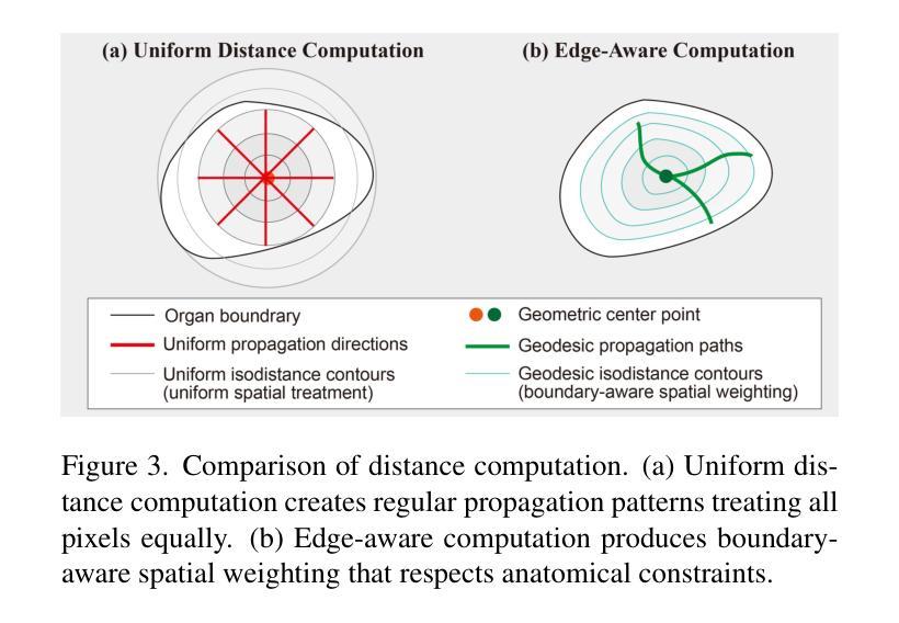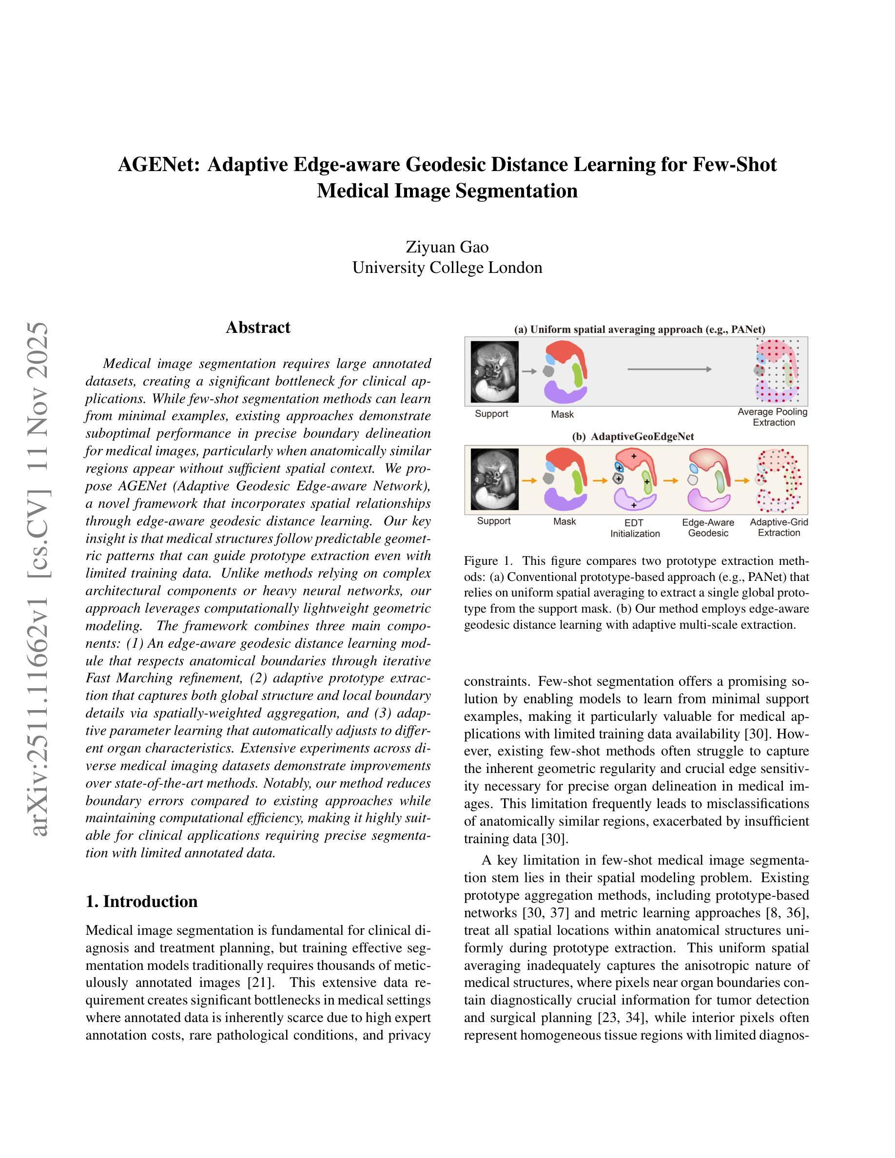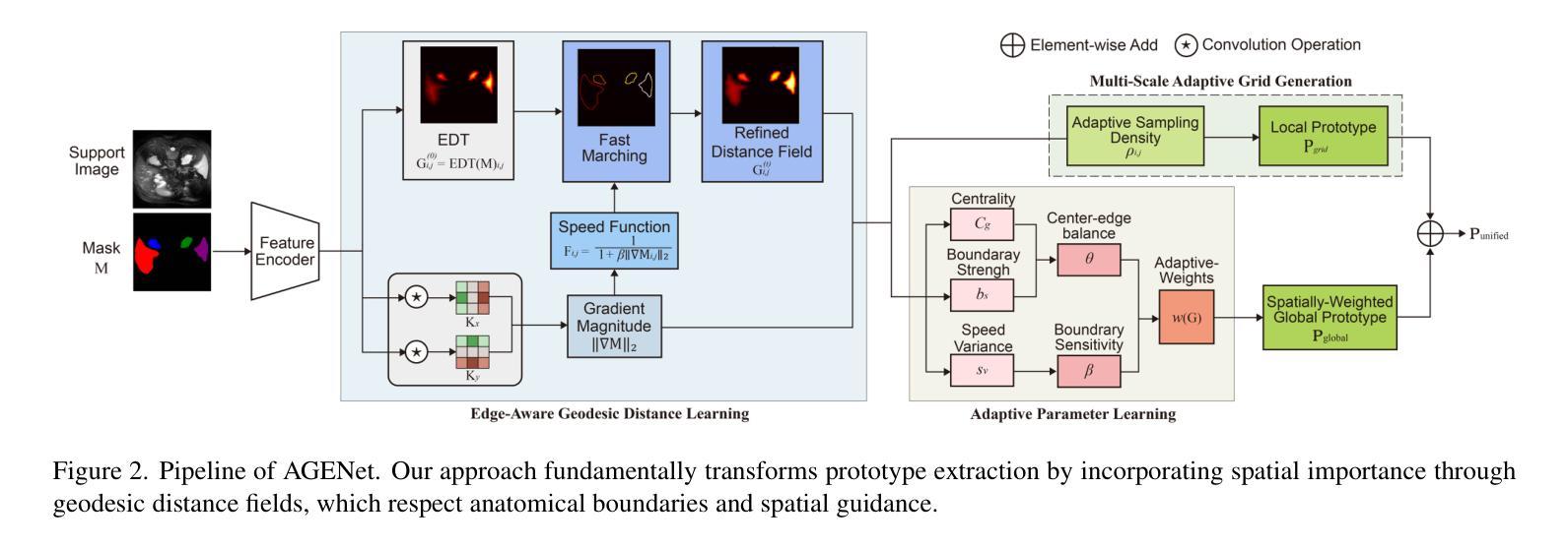 医疗图像分割需要大规模标注数据集,这成为临床应用中的瓶颈。针对这一问题,本文提出了一种新型框架AGENet(自适应测地线边缘感知网络),它通过边缘感知测地线距离学习技术来融合空间关系。文章主要观点是医学结构遵循可预测的几何模式,即使训练数据有限,也能引导原型提取。不同其他依赖复杂架构或大型神经网络的方法,AGENet采用计算轻量级的几何建模。该框架包含三个主要部分:尊重解剖边界的边缘感知测地线距离学习模块、通过空间加权聚合捕捉全局结构和局部边界细节的自适应原型提取以及自动适应不同器官特性的自适应参数学习。在多个医学图像数据集上的实验表明,与现有技术相比,本文的方法在减少边界误差的同时保持了计算效率,特别适用于需要精确分割和有限标注数据的临床应用。