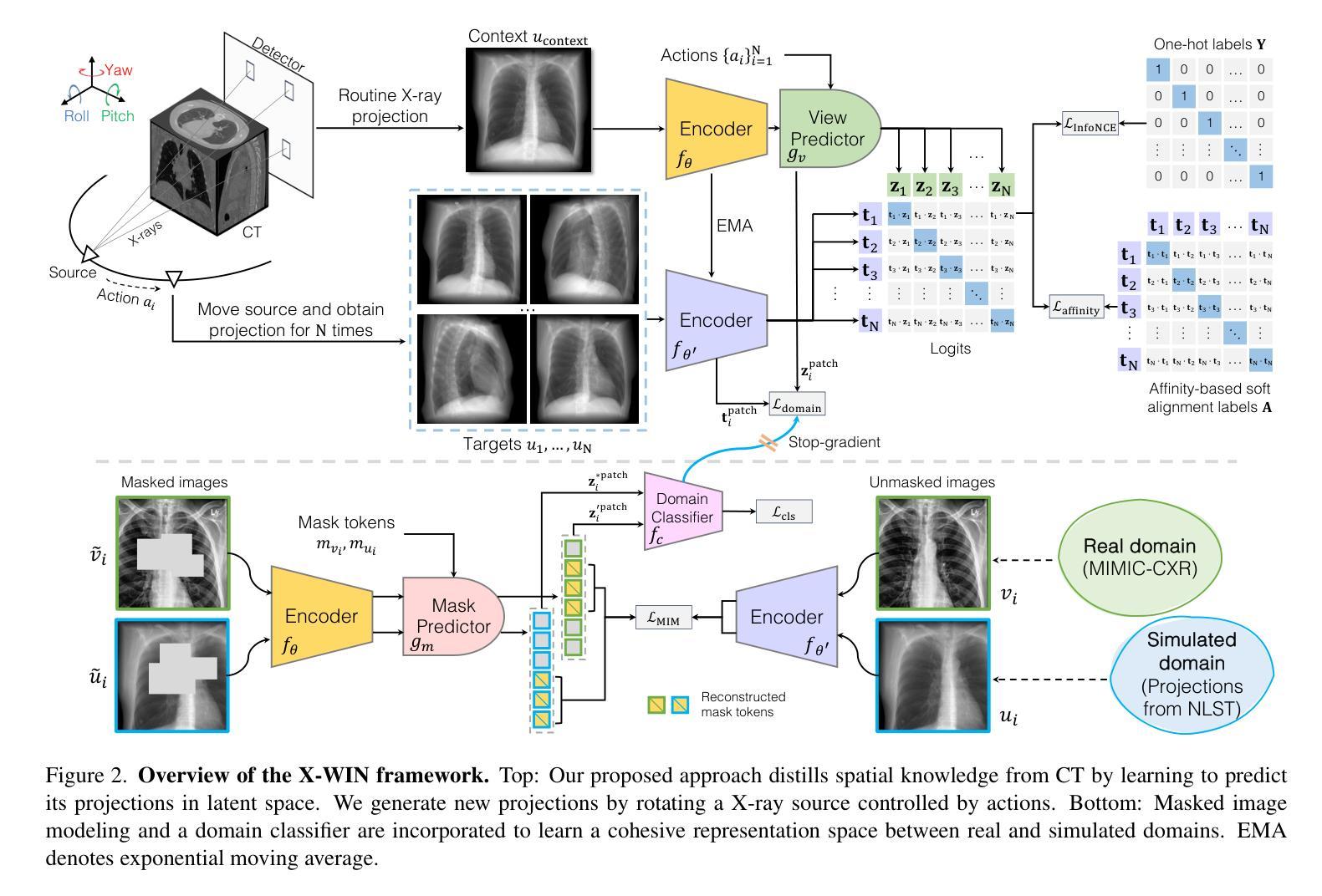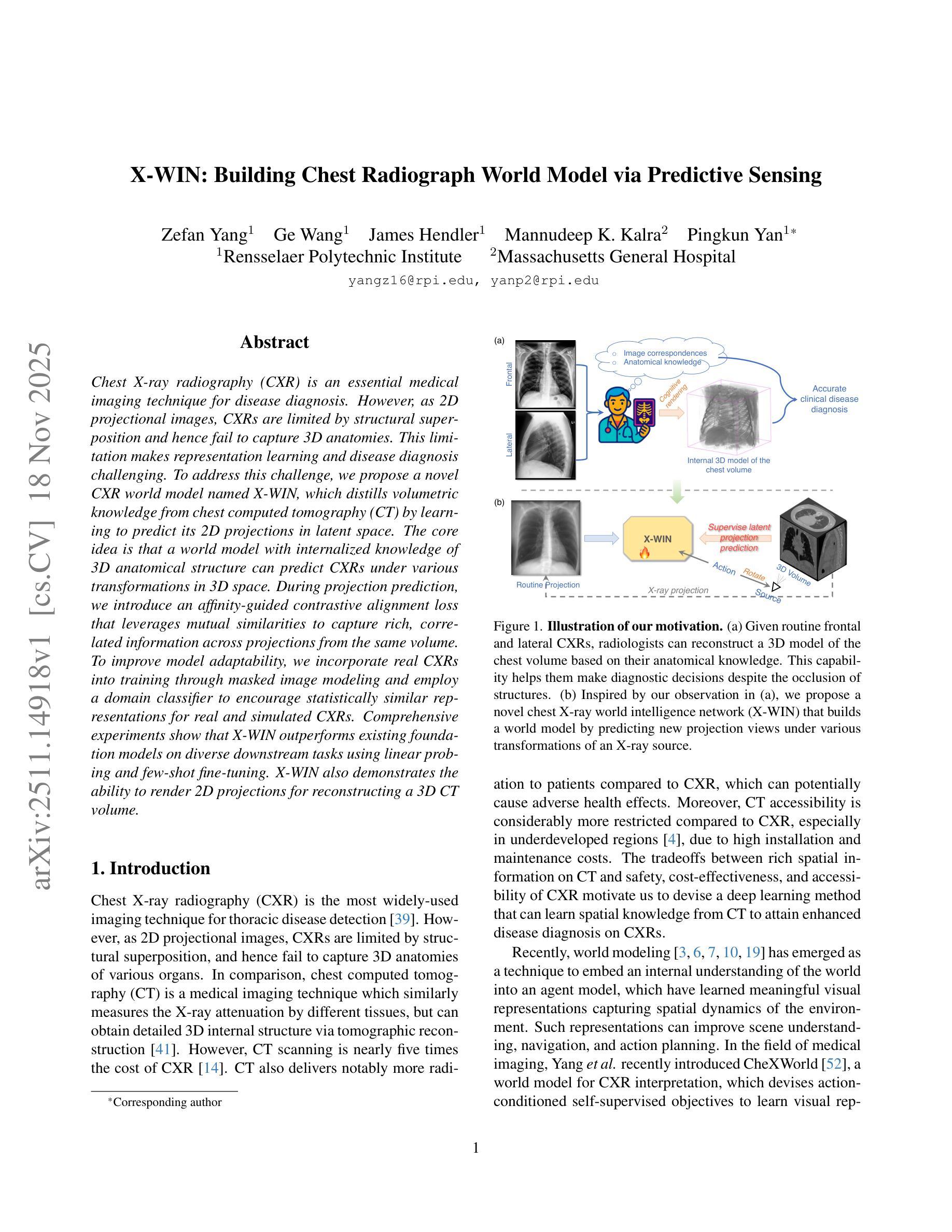 CXR(胸部X射线放射摄影)是疾病诊断的重要医学成像技术,但因其为二维投影图像,存在结构叠加的限制,难以捕捉三维解剖结构,使得表征学习和疾病诊断面临挑战。为解决这个问题,本文提出了一种名为X-WIN的新型CXR世界模型,通过学习预测三维胸部计算机断层扫描(CT)的二维投影来提炼体积知识。模型核心思想是具有内部化三维解剖结构知识的世界模型,可以预测在各种三维空间变换下的CXRs。在投影预测过程中,引入基于亲和度的对比对齐损失,利用相互相似性来捕获来自同一体积的投影之间的丰富关联信息。为提高模型适应性,通过掩盖图像建模将真实CXR纳入训练,并采用域分类器鼓励真实和模拟CXRs的统计表示相似。实验表明,X-WIN在多种下游任务上优于现有基础模型,具备通过线性探测和少量样本微调进行渲染的能力,还能重建三维CT体积的二维投影。