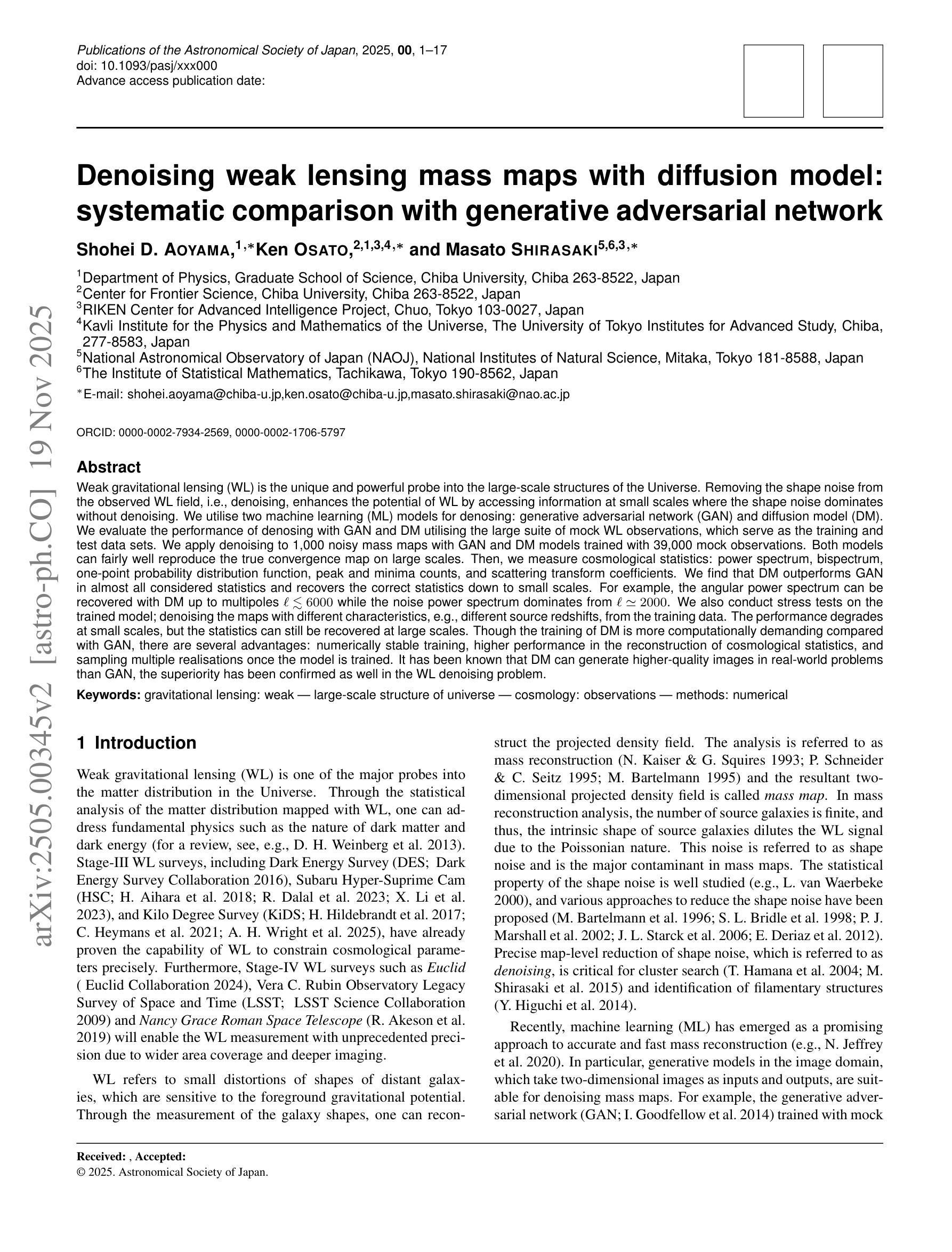 从观测到的弱引力透镜场去除形状噪声,即降噪,可以提高弱引力透镜的潜力。通过访问未降噪时形状噪声占主导地位的小尺度信息来实现这一点。我们利用两种机器学习模型进行降噪处理:生成对抗网络(GAN)和扩散模型(DM)。我们利用大量的模拟弱引力透镜观测结果来评估使用GAN和DM进行降噪的性能,这些观测结果既作为训练数据也作为测试数据集。我们将降噪应用于1000张带有噪声的质量图,这些图使用GAN和DM模型进行训练,训练数据为39000个模拟观测结果。两种模型在大尺度上都能较好地复现真实的收敛图。然后,我们测量宇宙学统计量:功率谱、双谱、一点概率分布函数、峰和谷计数以及散射变换系数。我们发现,在所有考虑的统计量中,DM几乎总是优于GAN,并恢复到小尺度的正确统计量。例如,用DM可以恢复到多重角≤6000的角功率谱,而从≈2000的角开始噪声功率谱占据主导。我们还对训练好的模型进行了压力测试,即对具有不同特征(例如不同的源红移)的地图进行降噪,这些特征不同于训练数据。虽然在小尺度上的性能有所下降,但在大尺度上仍能恢复统计量。尽管与GAN相比,DM的训练在计算上需求更高,但它有几个优点:数值稳定的训练、在重建宇宙学统计量方面性能更高,以及一旦模型训练完成就可以对多个实现进行采样。已知在现实世界的问题中,DM可以生成比GAN更高质量的图像,其在弱引力透镜消噪问题中的优越性也得到了证实。