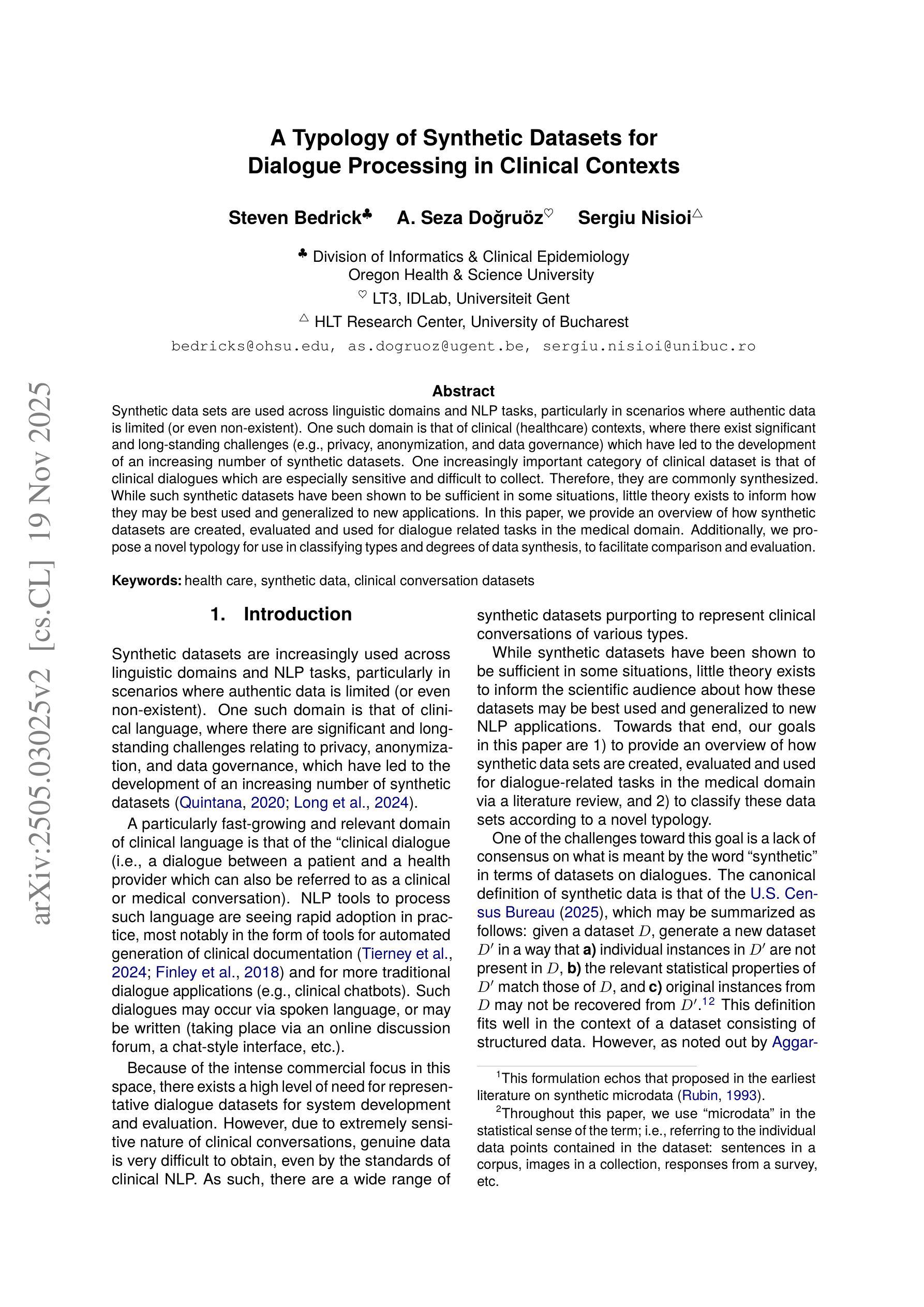 本文主要介绍了合成数据集在语言学领域和自然语言处理任务中的应用,特别是在真实数据有限或不存在的情况下。特别是在临床(医疗)环境中,由于存在隐私、匿名化和数据治理等长期存在的挑战,合成数据集的开发显得尤为重要。虽然合成数据集在某些情况下已被证明是足够的,但关于如何最好地使用和将其推广到新的应用的理论却很少。本文概述了如何在医疗领域为对话相关任务创建、评估和使用合成数据集,并提出了一种新型的分类和分类程度的数据合成类型学,以便进行比较和评估。