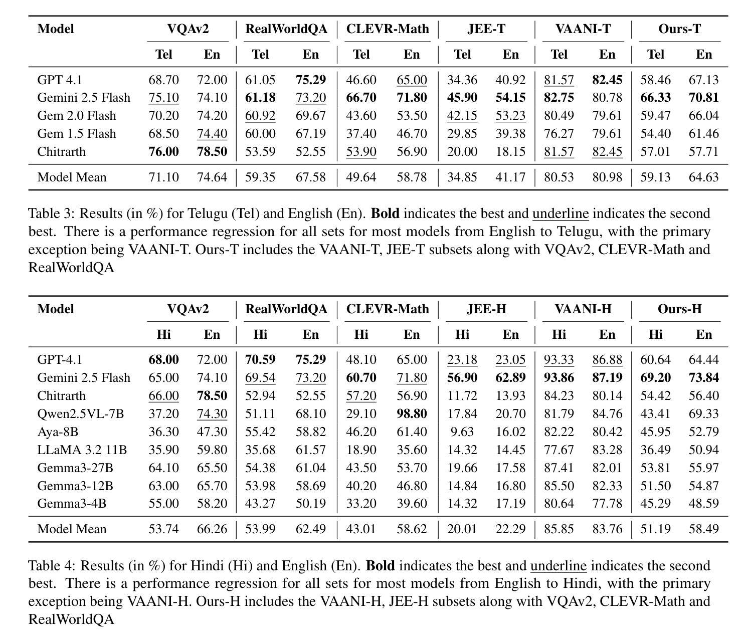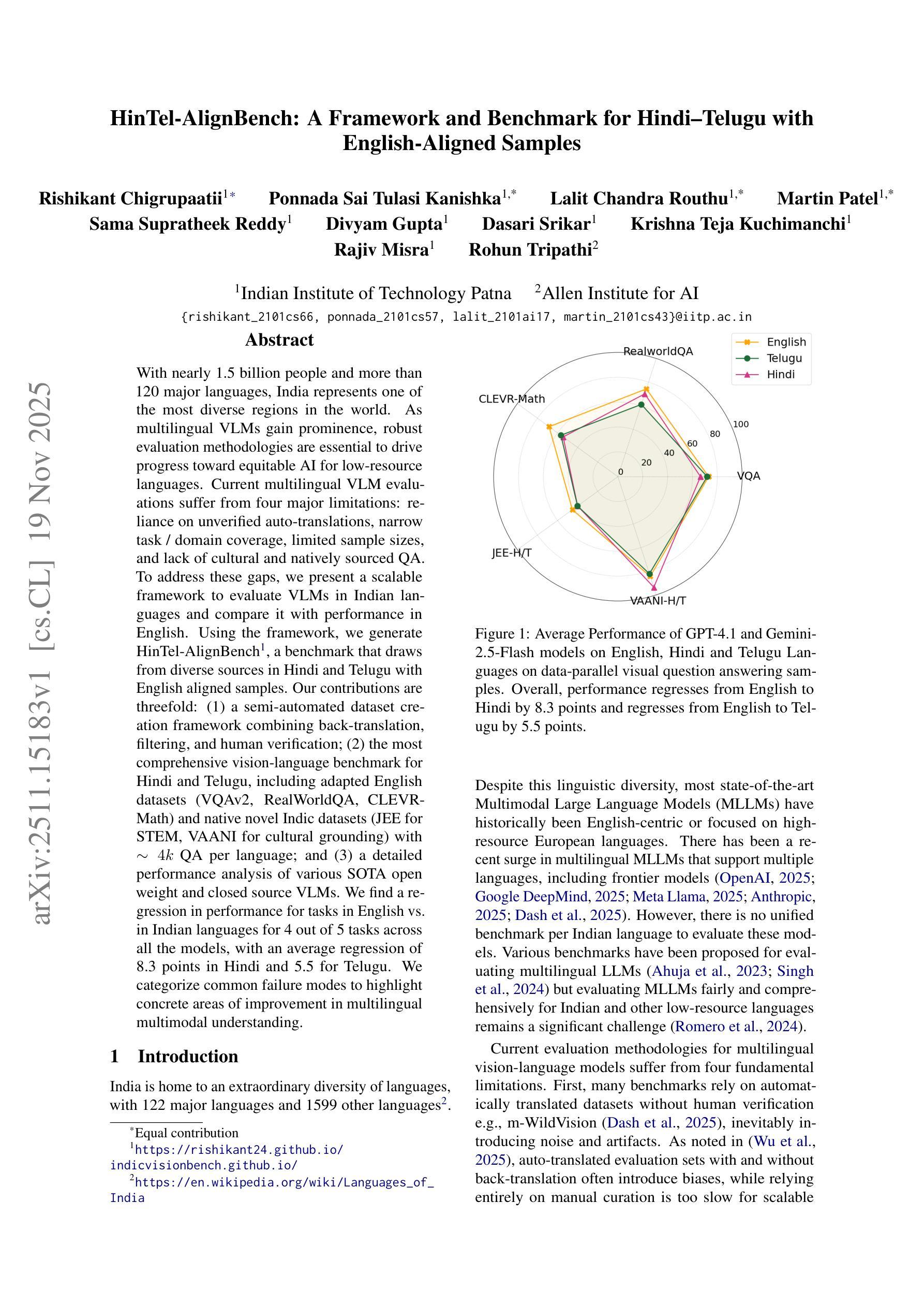 印度拥有近1.5亿人口和超过120种主要语言,是世界上多元化程度最高的地区之一。随着跨语言视觉模型(VLMs)的兴起,建立稳健的评估方法对于推动面向低资源语言的均衡人工智能发展至关重要。当前的多语言VLM评估存在四个主要局限性:依赖未经验证的自动翻译、任务/领域覆盖面狭窄、样本规模有限以及缺乏文化和本土来源的问题回答(QA)。为了解决这些差距,我们提出了一个可评估印度语言中VLMs的可扩展框架,并将其与英语性能进行比较。使用该框架,我们创建了HinTel-AlignBench基准测试,该测试从印地语和泰卢固语的多种来源中抽取样本,并与英语对齐的样本进行比较。我们的贡献有三点:(1)结合回译、过滤和人工验证的半自动数据集创建框架;(2)印地语和泰卢固语中最为全面的视觉语言基准测试,包括改编的英语数据集(VQAv2、RealWorldQA、CLEVR-Math)和本土新颖印度数据集(针对STEM的JEE、针对文化背景的VAANI),每种语言约有4000个问答对;(3)对最先进的公开权重和闭源VLMs进行详细性能分析。我们发现,在英语和印度语任务中,所有模型的4个任务中有5个在印度的表现有所下滑,印地语平均下降8.3分,泰卢固语下降5.5分。我们归纳了常见的失败模式,以突出改进多语言多模态理解的重点领域。