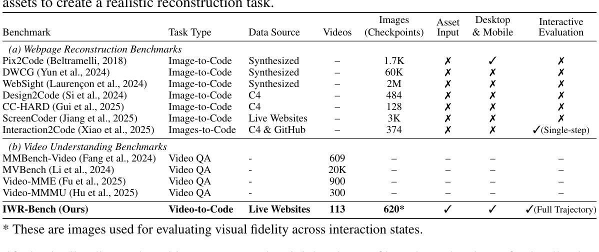 本文介绍了一个名为IWR-Bench的新型基准测试,该测试旨在评估大型视觉语言模型(LVLMs)在视频交互式网页重建中的能力。IWR-Bench包含了来自真实世界的网站的113项精心挑选的任务,涵盖用户交互视频以及所有爬取的静态资源(如图片和视频)。这一基准测试评估了模型面临两个基本挑战:从视频和资产中推断交互逻辑的综合跨模态推理能力,以及将这些逻辑转化为功能性代码的先进代码生成能力。结果显示现有模型的局限性,并确立IWR-Bench为视觉语言研究的前沿挑战。