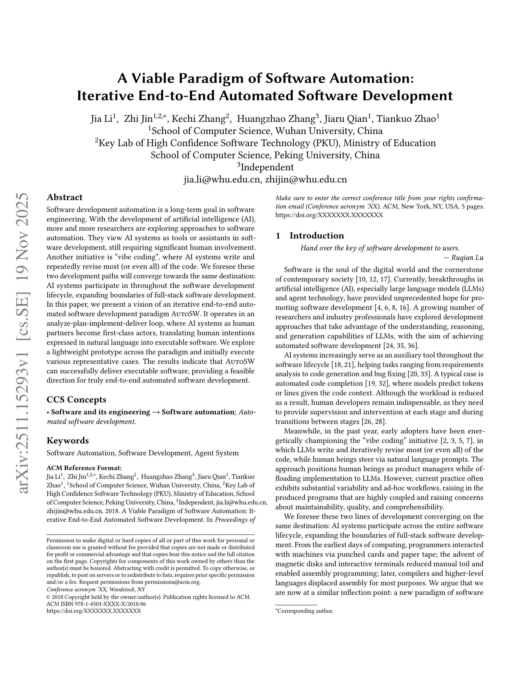 自动化软件开发是软件工程领域的长期目标。随着人工智能(AI)的发展,越来越多的研究者正在探索软件自动化的方法。他们认为AI系统是软件开发中的工具或助手,仍然需要大量的人类参与。另一种倡议是“振动编码”,其中AI系统编写并反复修改大部分(甚至全部)代码。我们预计这两条发展道路将朝着同一目标发展:AI系统参与整个软件开发生命周期,拓展全栈软件开发的边界。在本文中,我们提出了一个迭代端到端的自动化软件开发范式AutoSW的愿景。它在分析-计划-实施-交付的循环中运行,其中AI系统作为人类伙伴成为一等参与者,将人类以自然语言表达的意图翻译成可执行的软件。我们探索了跨范式的轻型原型,并初步执行了各种代表性案例。结果表明,AutoSW能够成功交付可执行的软件,为真正的端到端自动化软件开发提供了可行的方向。