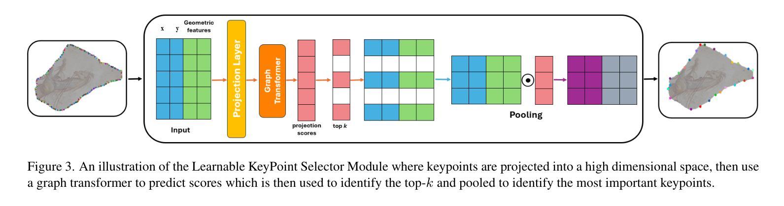 重组任务在多个领域都是一项重大挑战,包括考古学、基因组学和分子对接等。它要求精确地放置和定位元素,以重建原始结构。在这项工作中,我们解决了最先进的深度学习重组方法的三个主要局限性,即一)可扩展性;二)多模态;以及三)现实世界的适用性:超出正方形或简单几何形状,真实且复杂的侵蚀或其他现实世界的实际问题。我们提出了ReassembleNet方法,它通过简化复杂性来降低复杂性,通过将每个输入片段表示为轮廓关键点集,并利用图神经网络池化技术来学习选择最具有信息量的关键点。ReassembleNet方法有效降低计算复杂性的同时,还能实现对包括几何和纹理数据在内的多种特征数据的融合。通过在半合成数据集上进行预训练进一步增强其性能。然后,我们应用基于扩散的姿态估计来恢复原始结构。在RMSE旋转和平移方面,我们的方法分别改进了先前的57%和87%。