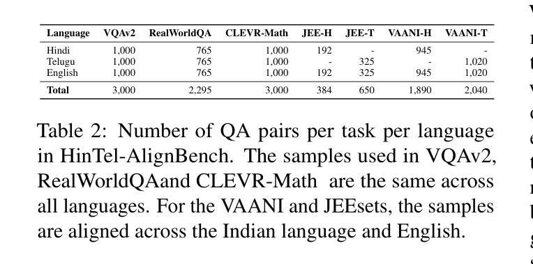 本文介绍了印度多语言Vision-Language Models(VLMs)评估的重要性和现有评估方法的局限性。为了解决这个问题,作者提出了一种可扩展的框架来评估印度语言的VLMs,并与英语性能进行比较。通过该框架,作者创建了Hindi和Telugu语言的基准测试数据集HinTel-AlignBench。该研究有三个主要贡献:半自动化数据集创建框架、包含多种语言的综合视觉语言基准测试数据集以及对多种最新VLMs的详细性能分析。研究发现,在印度语言的任务中,大部分模型在大部分任务上的性能有所下降。