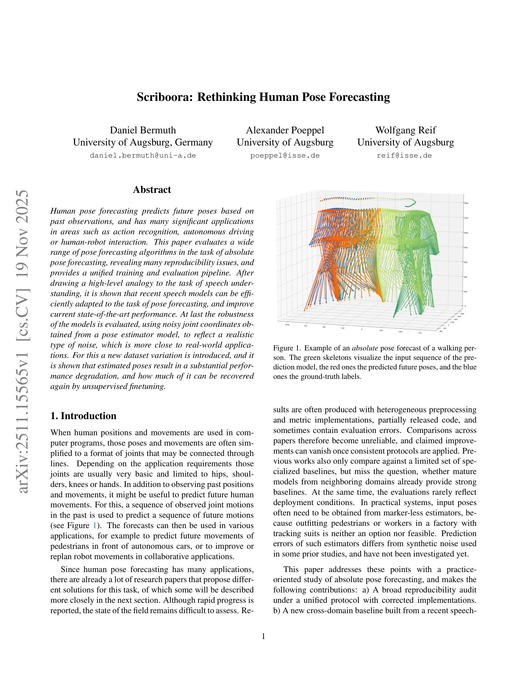 Human pose forecasting predicts future poses based on past observations, and has many significant applications in areas such as action recognition, autonomous driving or human-robot interaction. This paper evaluates a wide range of pose forecasting algorithms in the task of absolute pose forecasting, revealing many reproducibility issues, and provides a unified training and evaluation pipeline. After drawing a high-level analogy to the task of speech understanding, it is shown that recent speech models can be efficiently adapted to the task of pose forecasting, and improve current state-of-the-art performance. At last the robustness of the models is evaluated, using noisy joint coordinates obtained from a pose estimator model, to reflect a realistic type of noise, which is more close to real-world applications. For this a new dataset variation is introduced, and it is shown that estimated poses result in a substantial performance degradation, and how much of it can be recovered again by unsupervised finetuning.