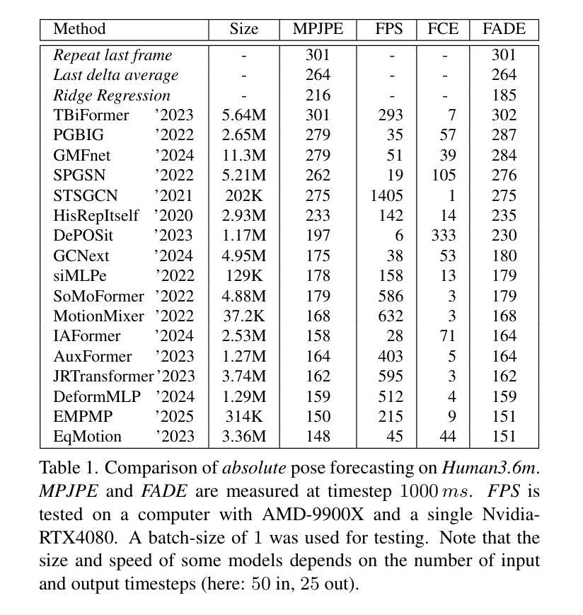 本文介绍了人类姿态预测的研究,包括绝对姿态预测的各种算法评估。文章指出了许多可重复性问题,并提供了一种统一的训练和评估流程。此外,文章通过类比语音理解任务,展示了近期语音模型可以高效适应姿态预测任务,提高了当前最先进的性能。最后,文章还评估了模型的稳健性,通过使用来自姿态估计模型的噪声关节坐标来模拟现实世界的噪声,并介绍了新的数据集变化。通过估计姿态导致的性能下降和通过无监督微调恢复的程度来展示。