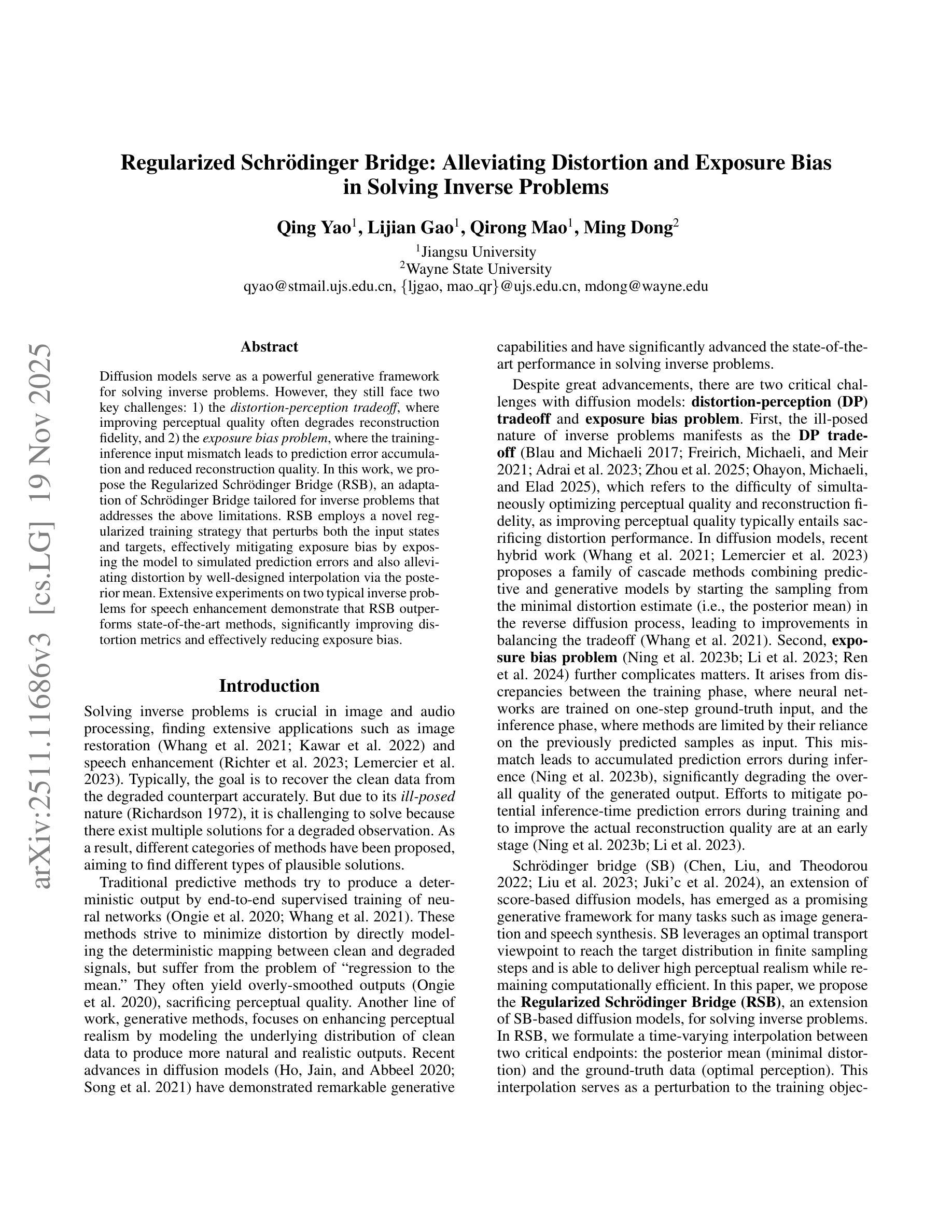 扩散模型是解决逆问题的强大生成框架,但仍面临失真与感知权衡以及暴露偏差问题。本研究提出正则化薛定谔桥(RSB),针对逆问题的薛定谔桥适应版本,能解决上述问题。RSB采用新型正则化训练策略,扰动输入状态和目标,有效减轻暴露偏差并缓解失真问题。在语音增强领域的两个典型逆问题实验中,RSB表现优于现有最先进方法,显著改进失真指标并有效减少暴露偏差。