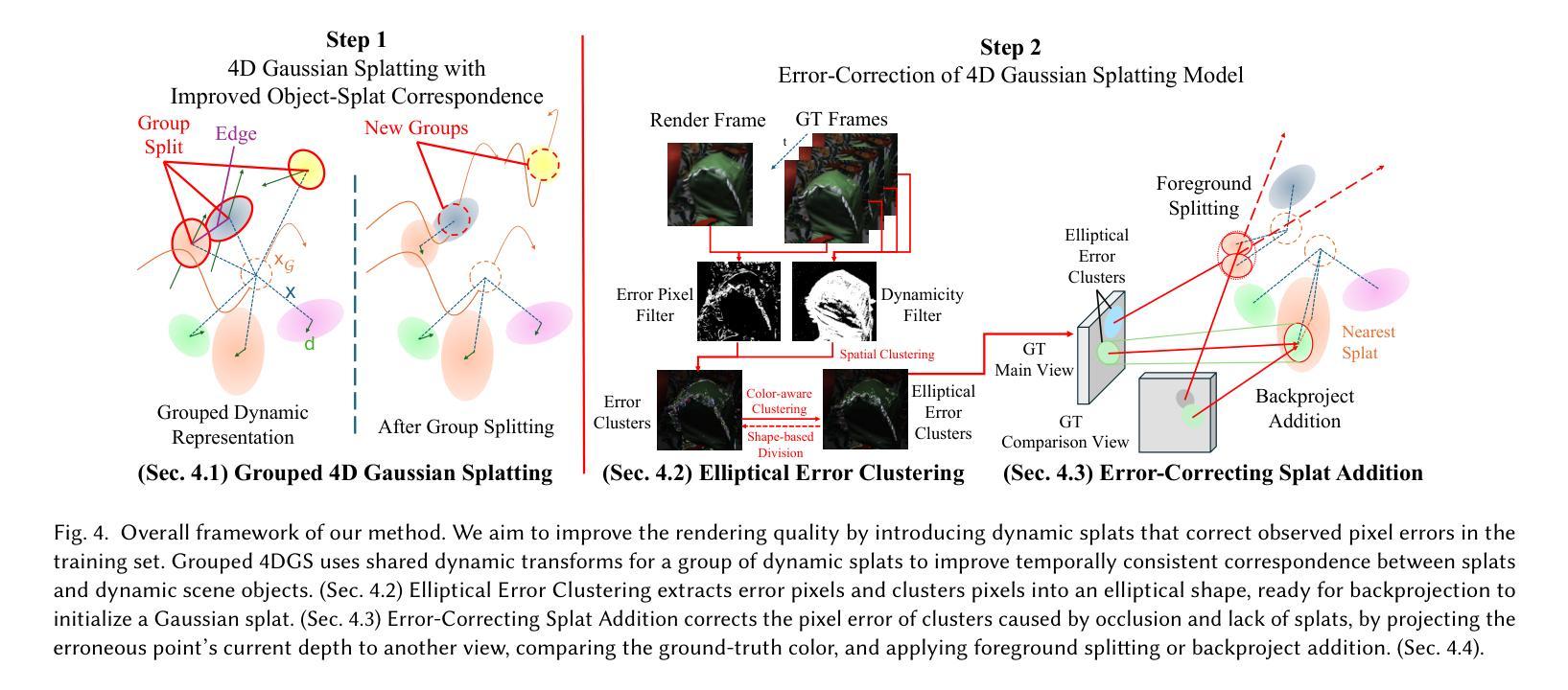 现有的四维高斯贴片(4DGS)方法在重建动态场景时面临困难,通常无法解决模糊像素对应关系以及动态区域密度不足的问题。我们通过引入一种新型方法来解决这些问题,该方法包含两个关键组成部分:(1)椭圆误差聚类及误差修正贴片添加,该方法能够精准定位动态区域,以改善并初始化拟合贴片;(2)分组四维高斯贴片技术,该技术可提高贴片之间映射的一致性,并体现动态对象。具体来说,我们将渲染错误分为缺色和遮挡两种类型,然后通过反向投影或前景分割进行有针对性的校正,这些校正操作由跨视图色彩一致性引导。在Neural 3D Video和Technicolor数据集上的评估表明,我们的方法大大提高了时间一致性,达到了先进的感知渲染质量,在Technicolor Light Field数据集上提高了0.39dB的峰值信噪比。我们的可视化显示,贴片与动态对象之间的对齐得到了改善,误差校正方法能够识别错误并适当初始化新贴片。我们的具体实现细节和源代码可在https://github.com/tho-kn/cem-4dgs找到。