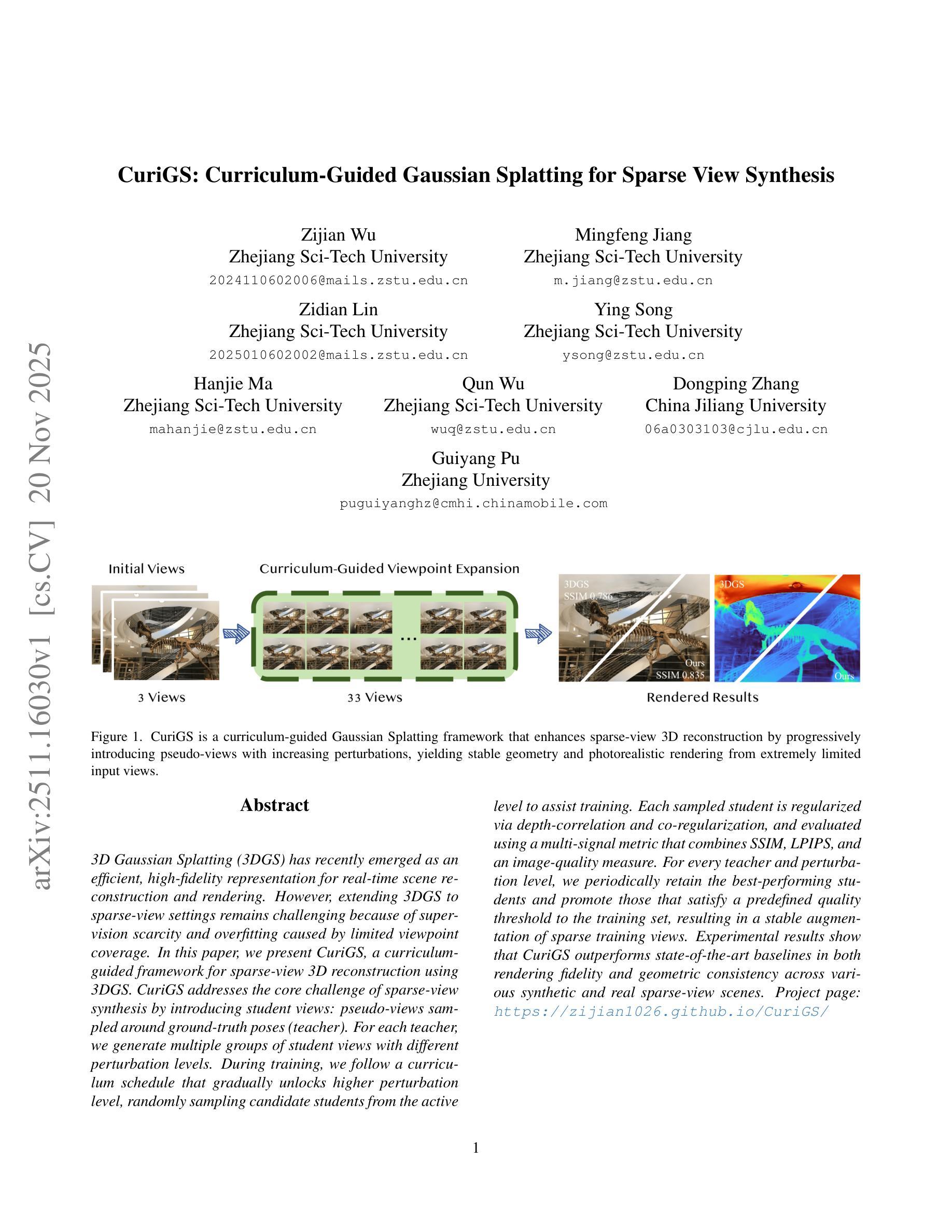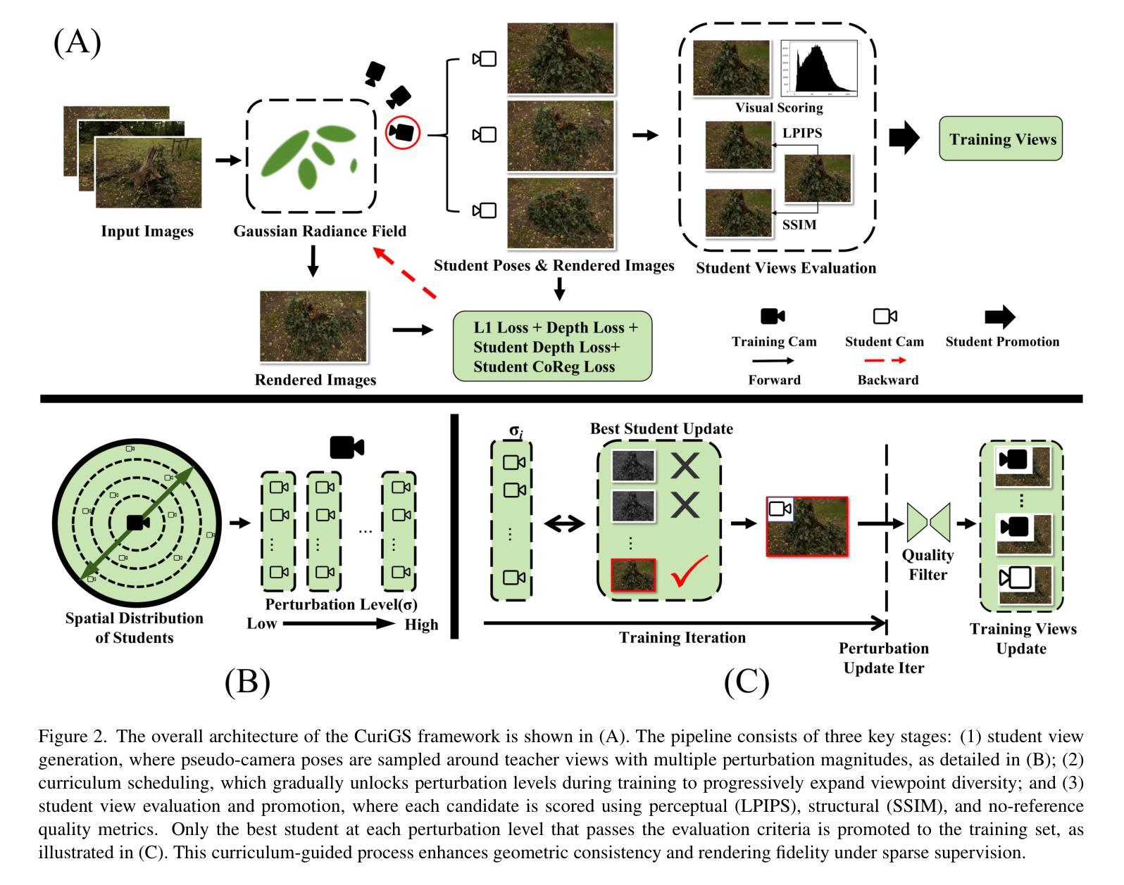 3D 高斯采样(3DGS)最近被作为一种高效的高保真表示技术,用于实时场景重建和渲染。然而,将3DGS扩展到稀疏视角设置仍然是一个挑战,因为缺乏监督以及由于视角覆盖有限导致的过拟合问题。在本文中,我们提出了CuriGS,这是一个使用3DGS的稀疏视图3D重建的课程教学框架。CuriGS通过引入学生视角来解决稀疏视角合成的核心挑战:即在真实姿势周围采样的伪视角(教师)。对于每个教师,我们生成多组具有不同扰动水平的学生视角。在训练过程中,我们遵循一个课程时间表,逐渐解锁更高的扰动水平,从活动水平中随机采样候选学生以辅助训练。每个采样的学生都会通过深度关联和协同规则进行规则化,并使用结合SSIM、LPIPS和图像质量测量的多信号度量进行评估。对于每个教师和每个扰动水平,我们定期保留表现最好的学生,并将满足预设质量阈值的学生提升到训练集,从而实现稀疏训练视角的稳定增强。实验结果表明,CuriGS在渲染保真度和几何一致性方面优于各种合成和真实稀疏视角场景的最先进基线。项目页面:https://zijian1026.github.io/CuriGS/