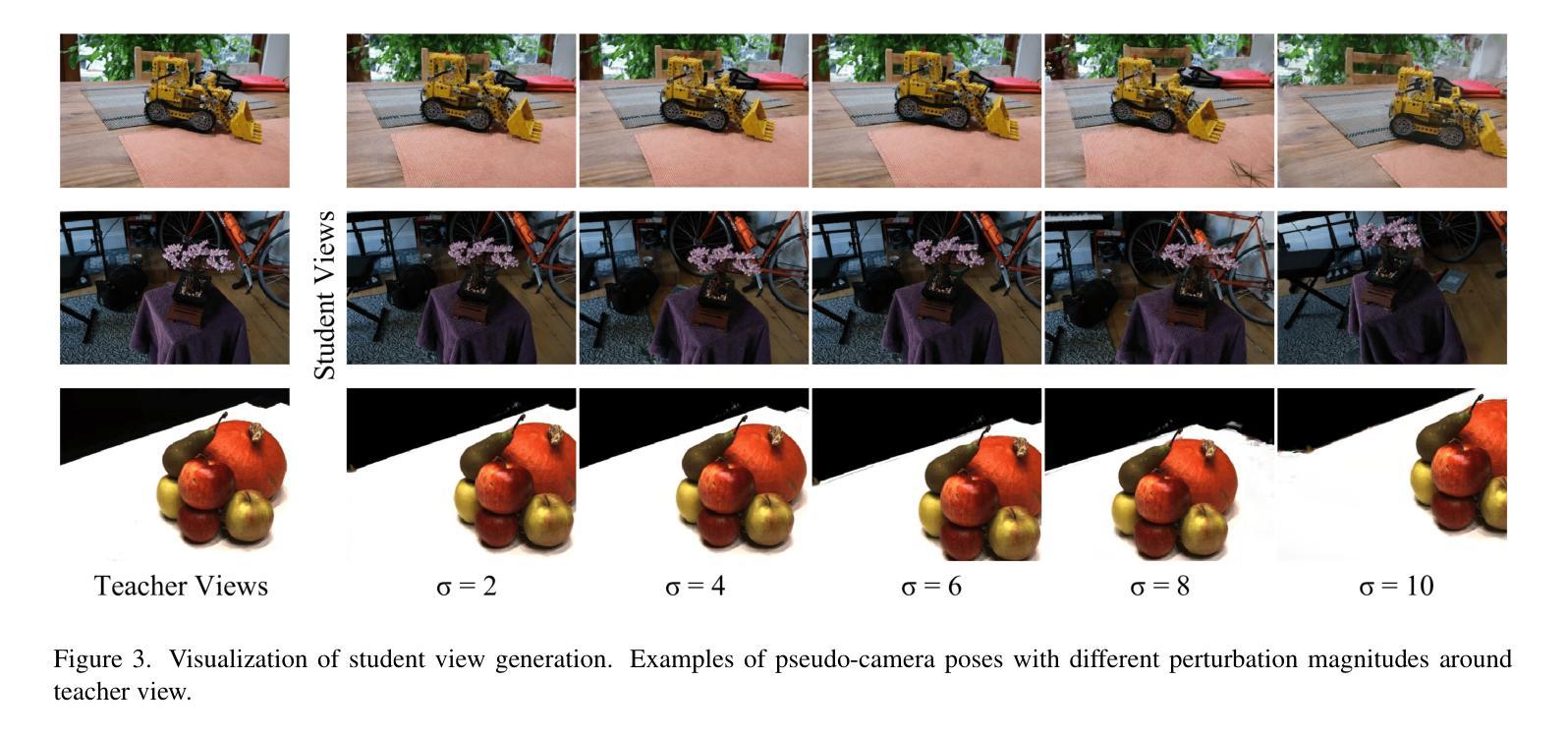 - 学生视角是通过在真实姿态周围采样伪视角来生成的,每个老师对应生成多个不同扰动级别的学生视角。