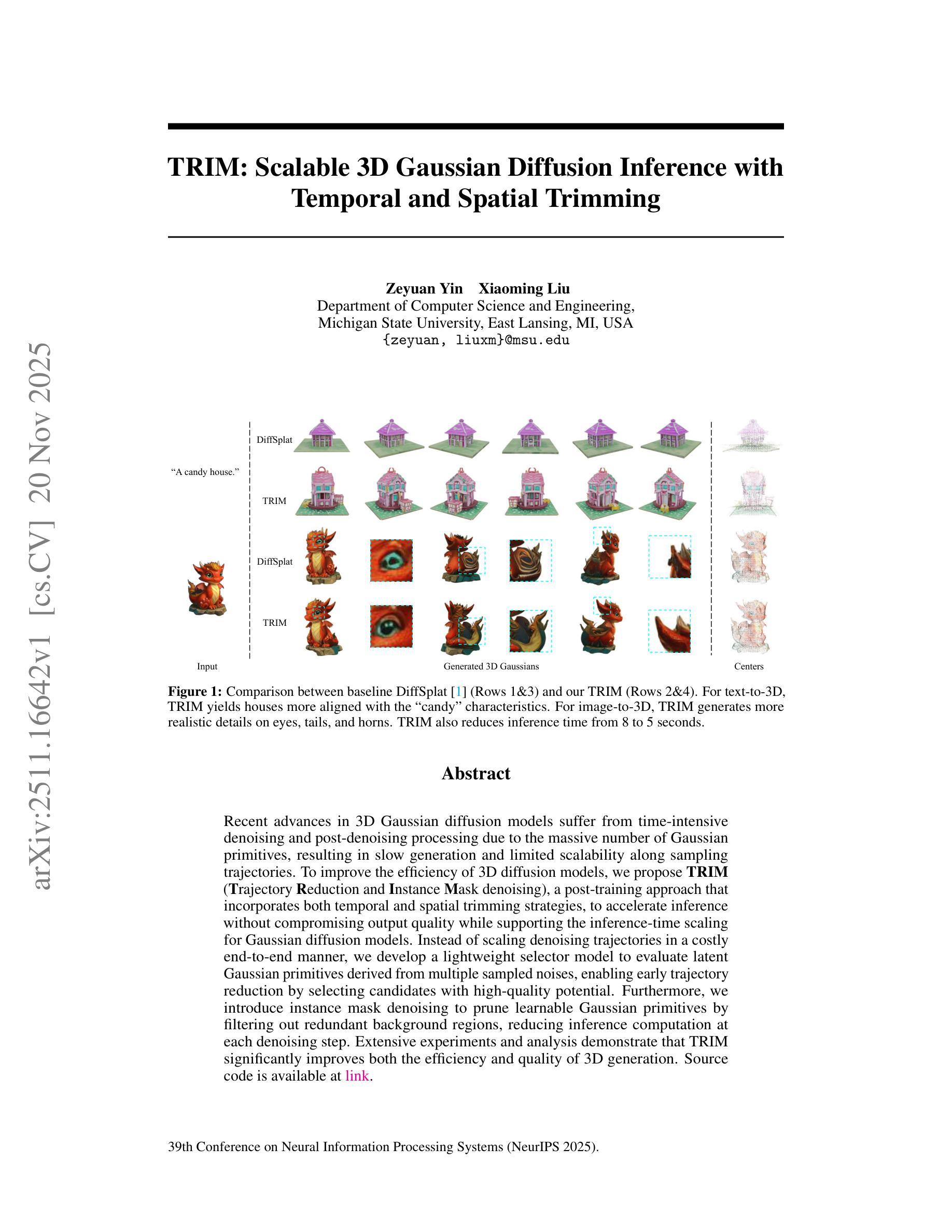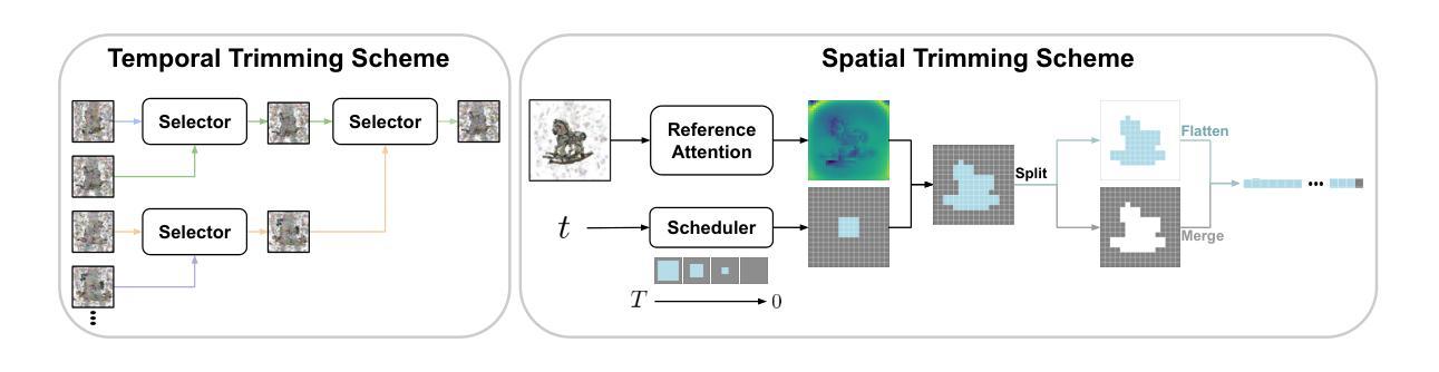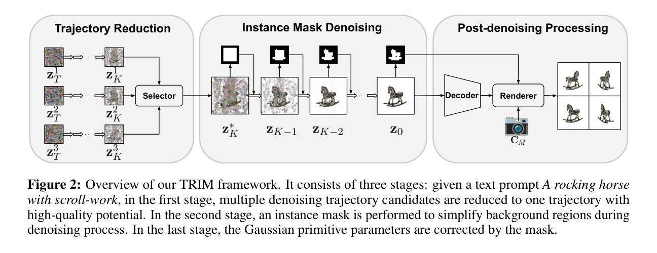近期三维高斯扩散模型的进展因大量高斯基元而面临耗时的去噪和去噪后处理,导致生成速度慢和沿采样轨迹的可扩展性有限。为了提高三维扩散模型的效率,我们提出了TRIM(轨迹减少和实例掩膜去噪),这是一种后训练方法,结合了时间和空间的修剪策略,以加速推理过程,同时支持高斯扩散模型的推理时间缩放而不损害输出质量。我们并不以昂贵的方式端到端地调整去噪轨迹的缩放,而是开发了一个轻量级的选择器模型,以评估来自多个采样噪声的潜在高斯基元,通过选择具有高质量潜力的候选者来实现早期的轨迹减少。此外,我们引入了实例掩膜去噪,通过过滤掉冗余的背景区域来修剪可学习的高斯基元,从而减少每个去噪步骤的推理计算。大量的实验和分析表明,TRIM显著提高了三维生成的质量和效率。源代码可在链接中找到。