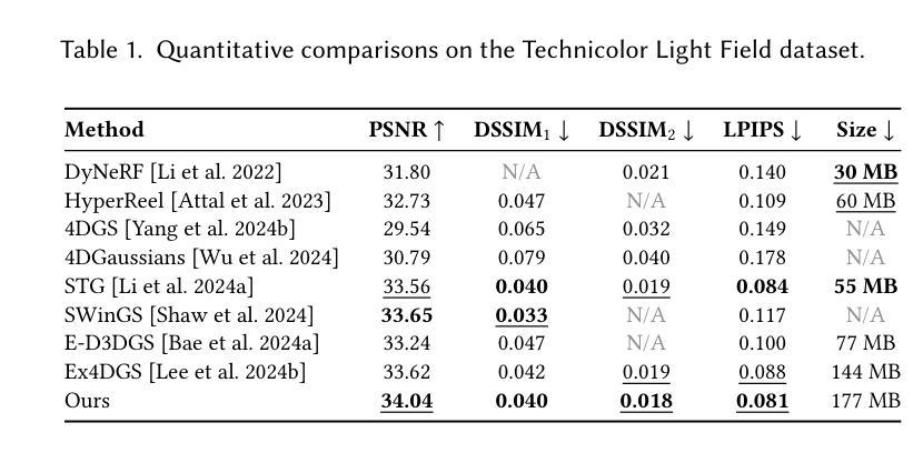 - 技术在Neural 3D Video和Technicolor数据集上表现优异。