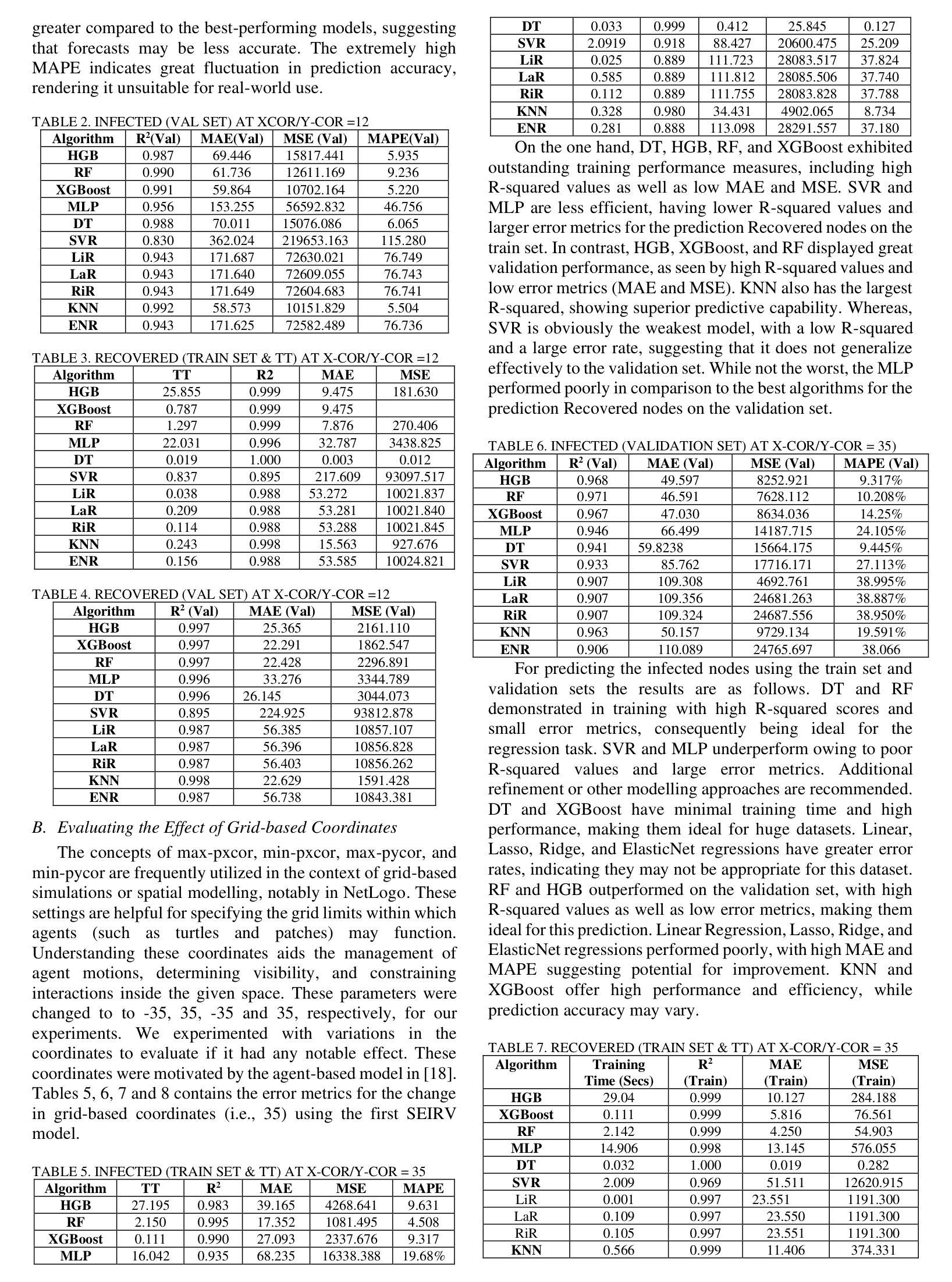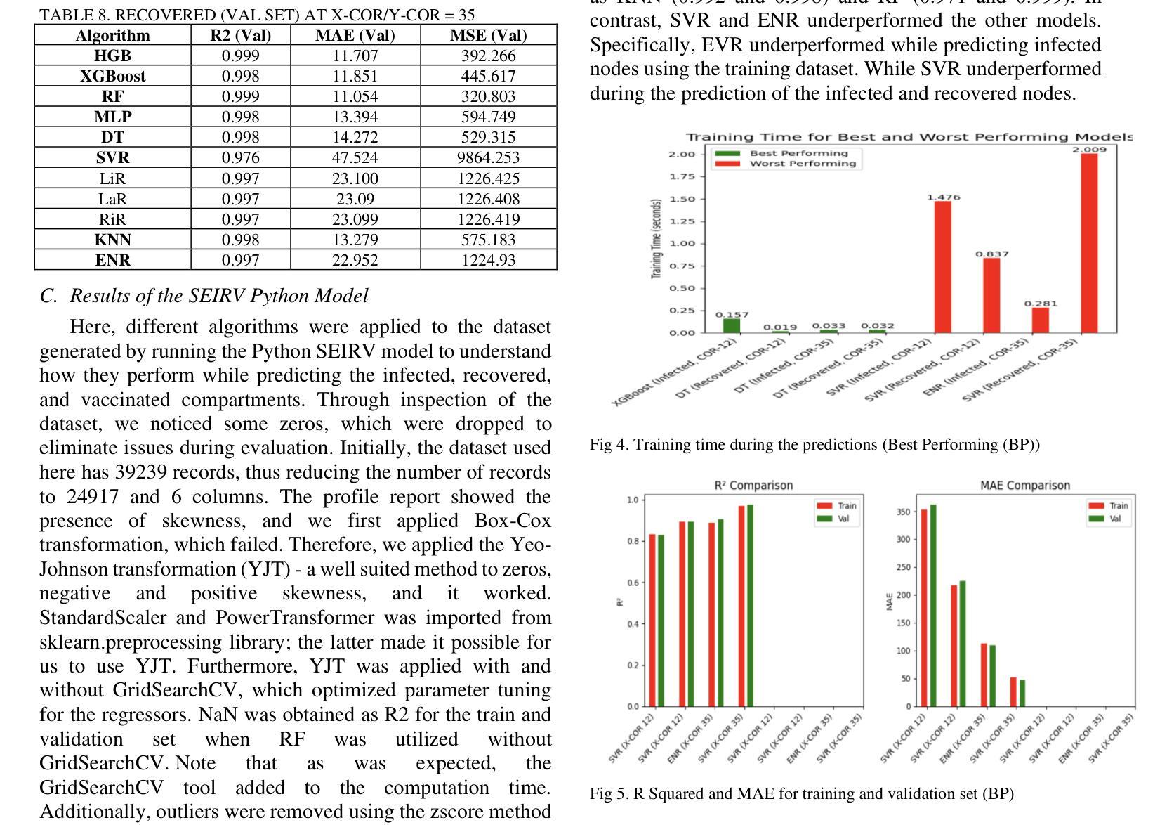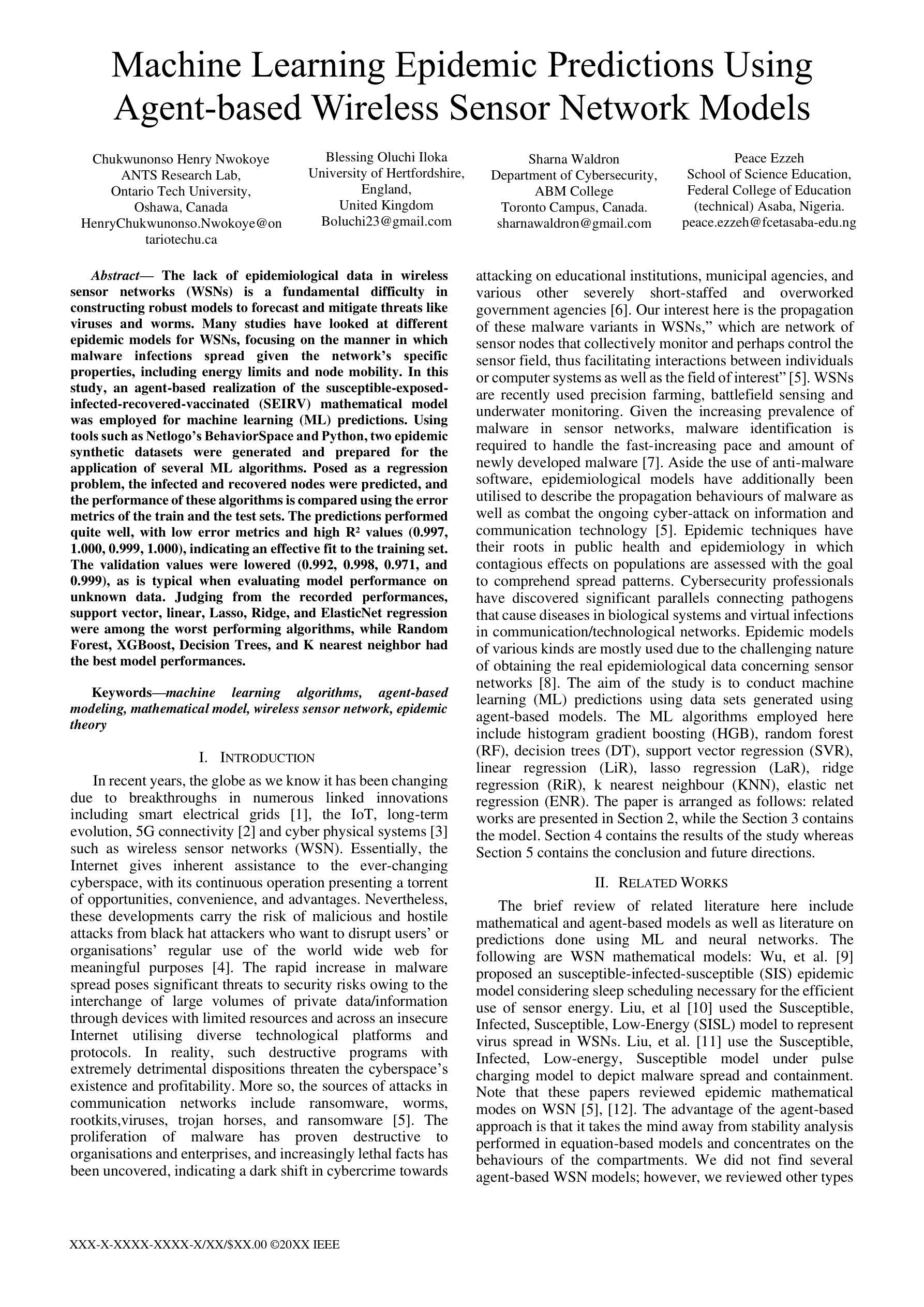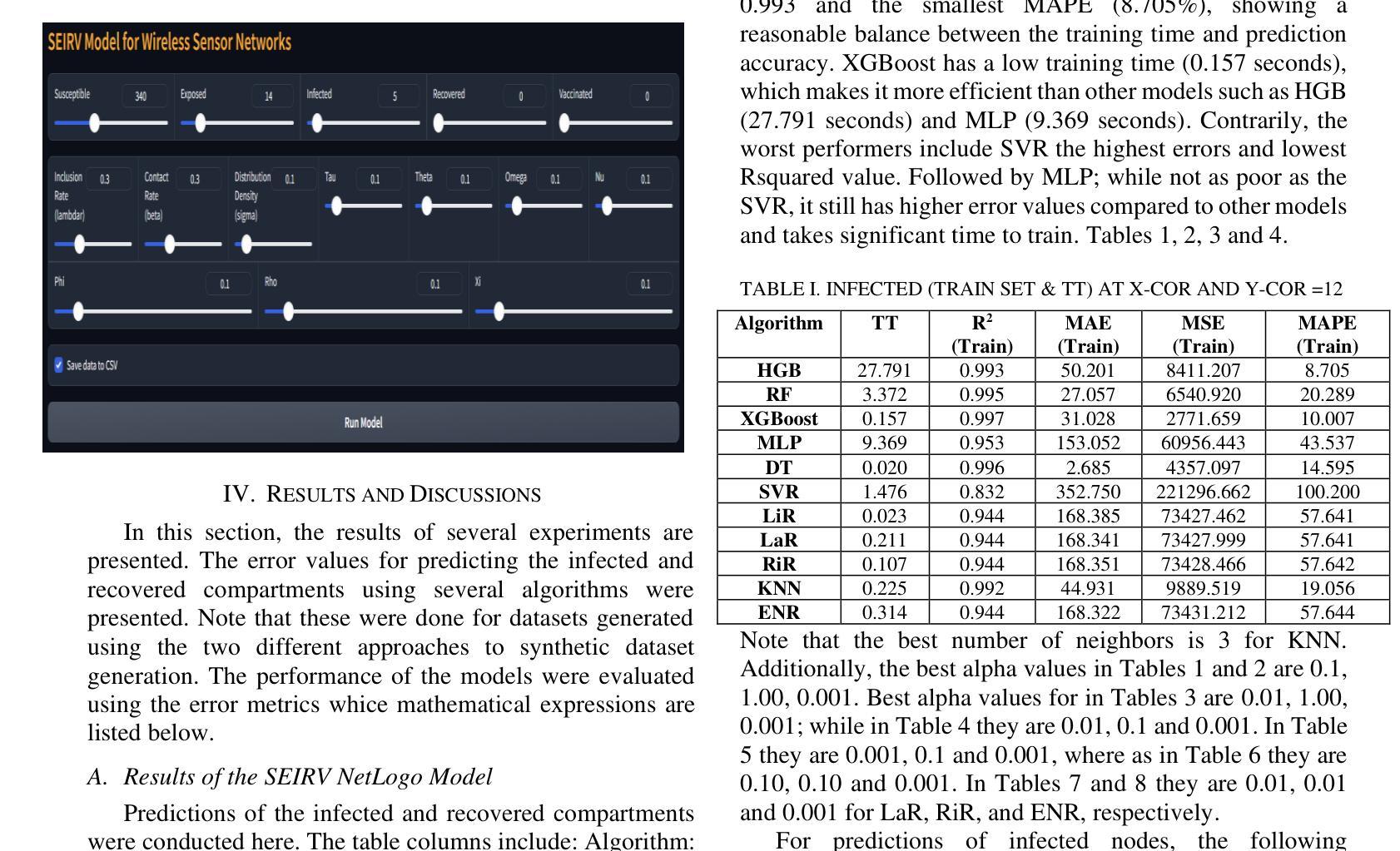 在无线传感器网络(WSNs)中,由于缺乏流行病学数据,构建稳健模型以预测和缓解病毒和蠕虫等威胁是一个基本难题。本研究采用基于agent的SEIRV数学模型进行机器学习预测,利用NetLogo的BehaviorSpace和Python等工具生成两个合成数据集,并应用多种机器学习算法。预测表现良好,误差指标较低,R²值较高,表明模型训练良好。但在未见数据上的验证值较低,这是模型性能评估中的正常现象。根据记录的表现,某些回归算法表现不佳,而某些决策树和邻近算法则取得了最佳结果。