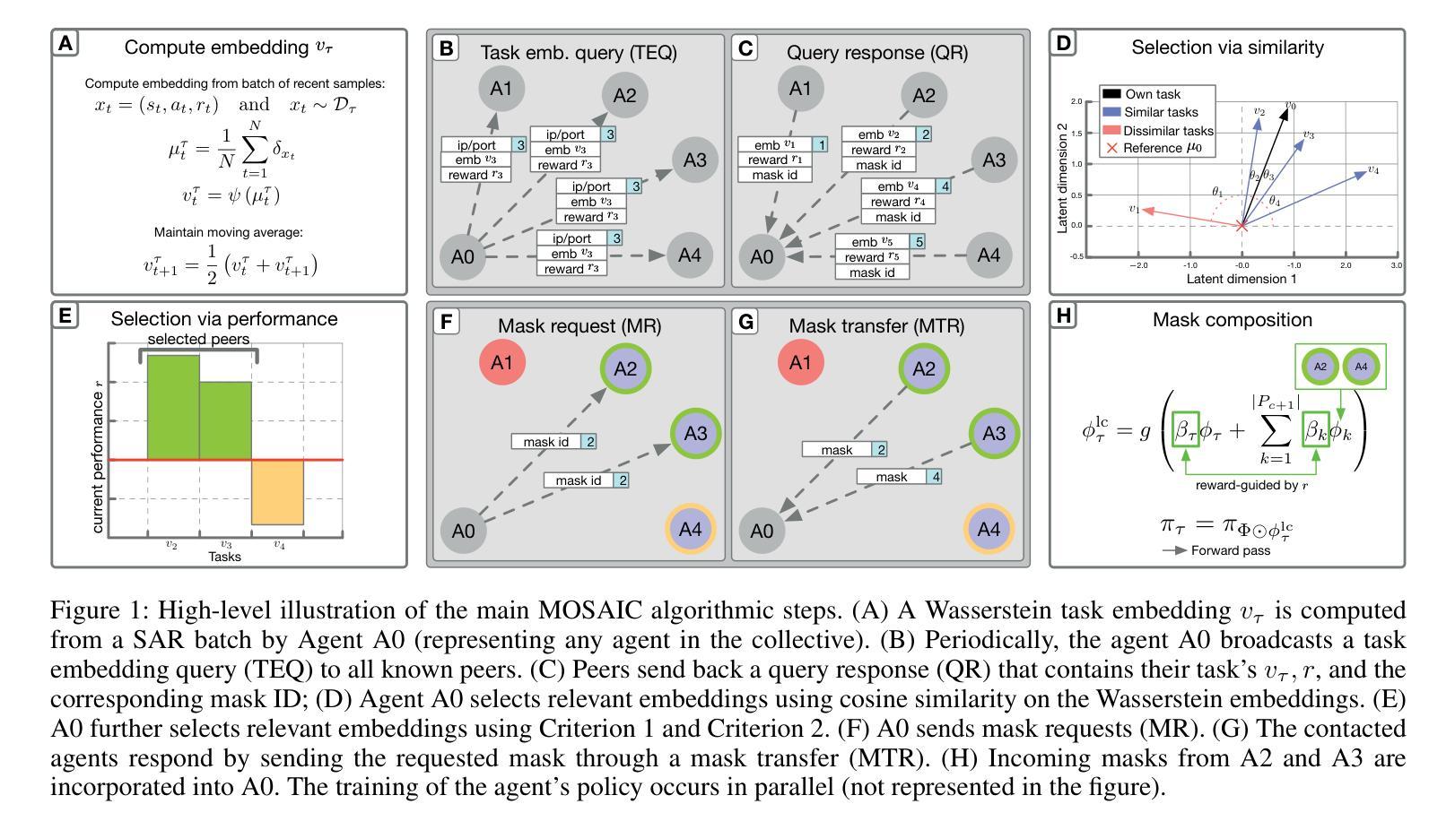 智能体AI旨在创建能够自主设定目标、适应变化并通过持续经验改进行为的系统。本研究探讨了智能体在面临多重和未预见任务时,如何选择、整合其他智能体的策略以加速自身学习的问题。提出的MOSAIC算法通过任务嵌入的性能信号和余弦相似性进行知识选择,利用掩膜实现模块化和可转移的神经表征,以及策略集成、组合和微调。MOSAIC在学习速度和整体性能上均优于孤立学习者和全局共享方法,并在某些情况下能解决孤立智能体无法解决的问题。此外,该算法降低了任务干扰的敏感性,并观察到解决简单任务的智能体通过共享知识加速解决复杂任务的自组织现象。