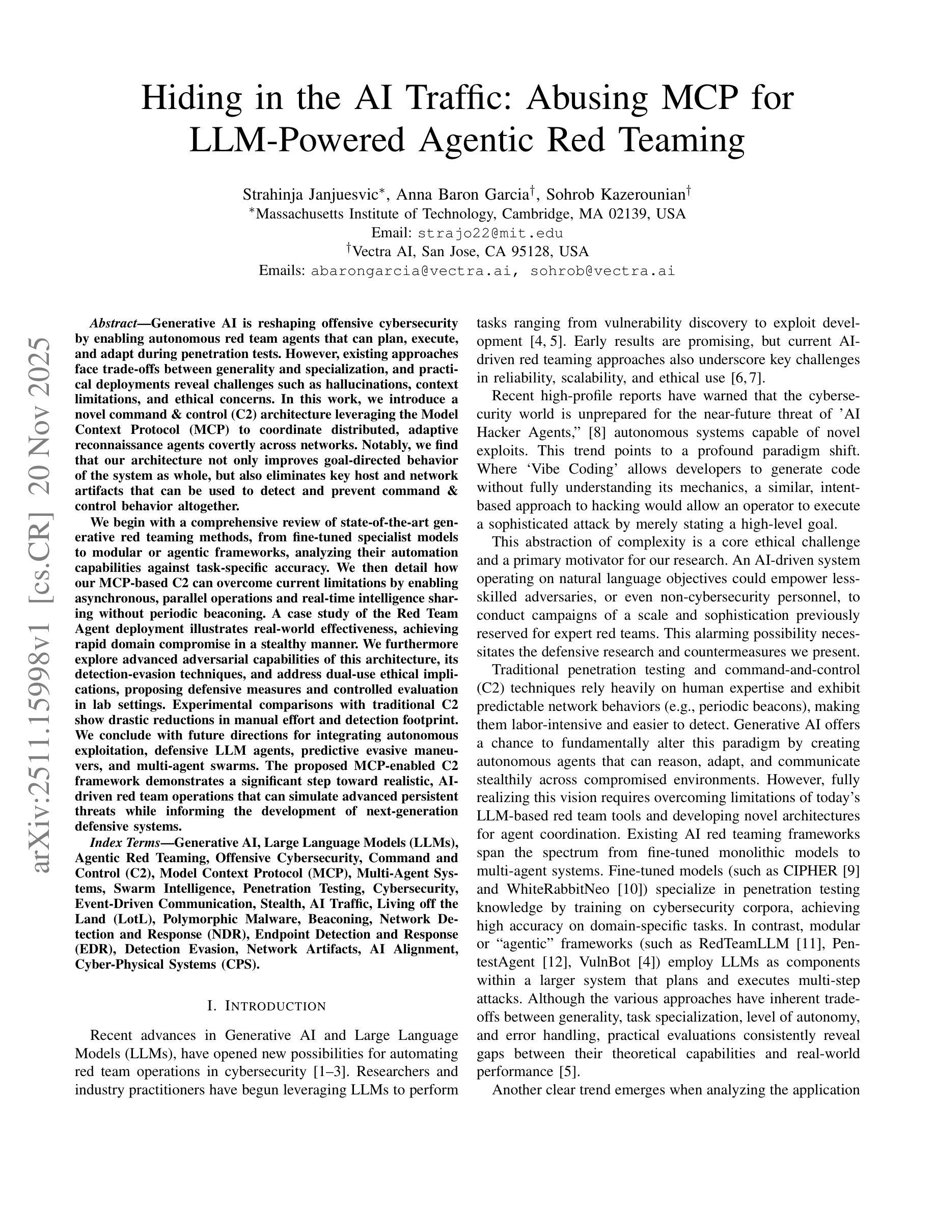 生成式人工智能正在通过支持自主的红队代理进行渗透测试中的规划、执行和适应,从而改变进攻性的网络安全。然而,现有方法面临通用性和专业化之间的权衡,实际部署中暴露出幻觉、上下文限制和伦理问题等挑战。在这项工作中,我们引入了一种新型命令与控制(C2)架构,利用模型上下文协议(MCP)来协调跨网络的分布式自适应侦察代理。值得注意的是,我们发现我们的架构不仅提高了整个系统的目标导向行为,而且消除了关键主机和网络特征,这些特征原本可用于检测和阻止命令与控制行为。我们首先对最新的生成式红队方法进行全面评述,从微调的专业模型到模块化或代理框架,分析其自动化能力与特定任务的准确性。然后,我们详细介绍了基于MCP的C2如何克服现有限制,通过支持异步并行操作和实时情报共享而无需定期发送信号来实现。我们还探讨了该架构的高级对抗能力、其隐身技术,并探讨了其双重用途的伦理影响,提出了防御措施并在实验室环境中进行了受控评估。与传统C2的实验比较显示,手动操作的减少和检测足迹的大幅减少。我们最后探讨了未来方向,包括整合自主利用、防御性大型语言模型代理、预测躲避机动以及多代理群体等。所提出的基于MCP的C2框架朝着现实、AI驱动的红队行动迈出了重要一步,能够模拟高级持续威胁,同时为下一代防御系统的发展提供信息。