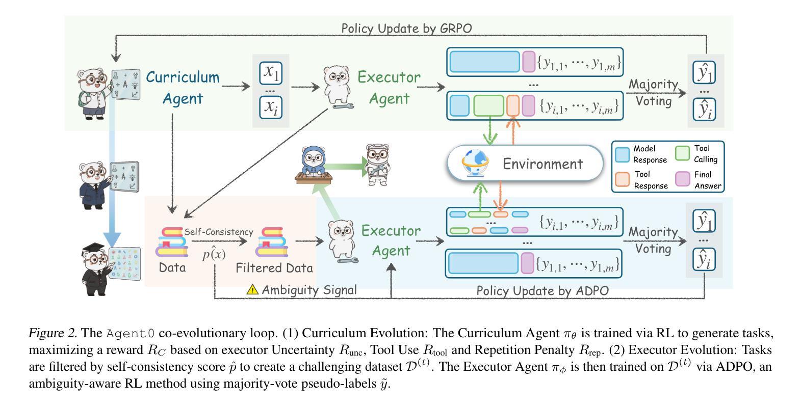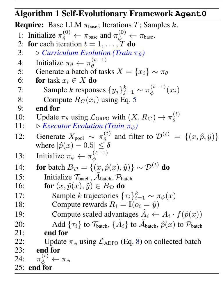 - 通过迭代过程,Agent0建立了一个自我加强的循环来持续产生高质量的课程。