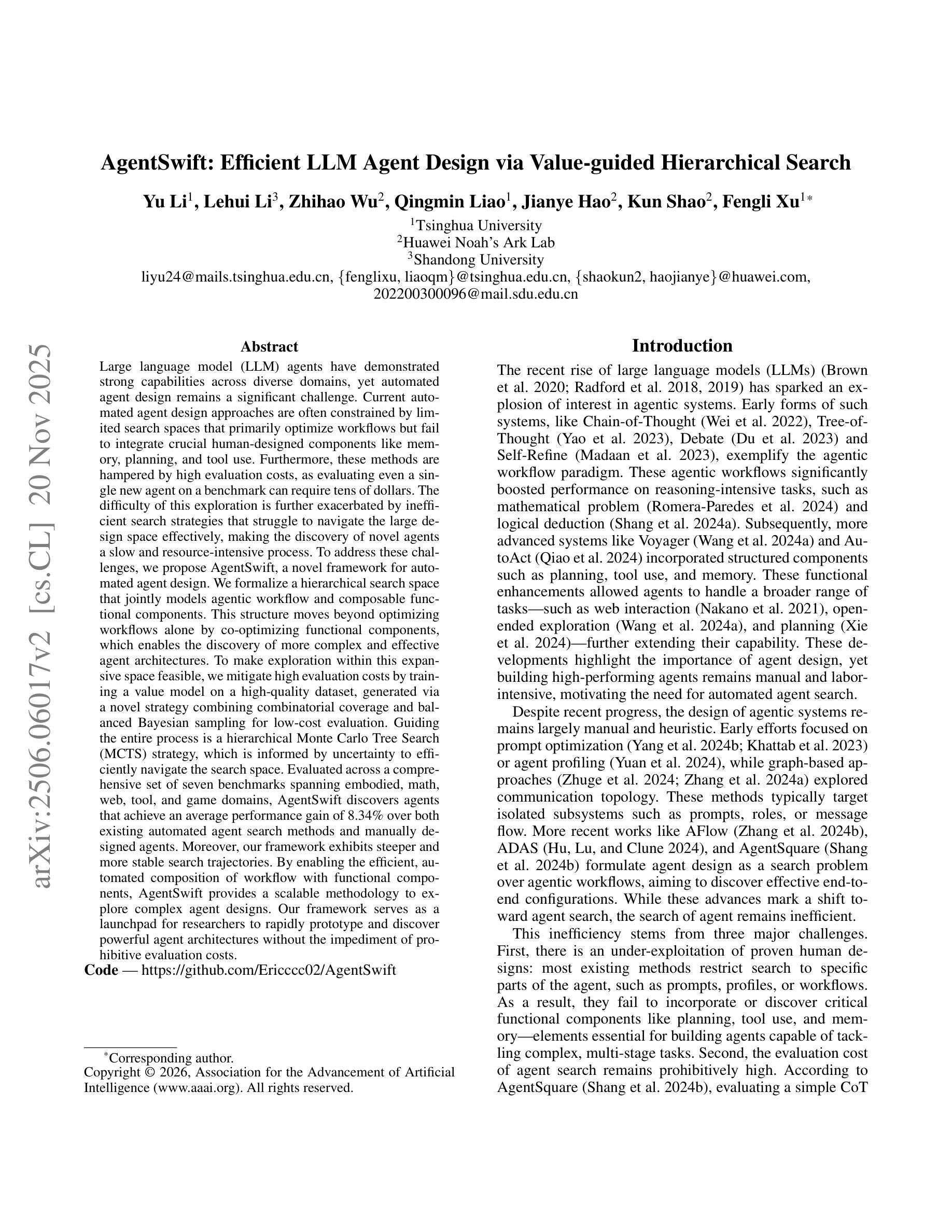 大型语言模型(LLM)代理在多个领域表现出了强大的能力,然而,自动代理设计仍然是一个重大挑战。当前的自动代理设计方法通常受限于有限的搜索空间,这些空间主要优化工作流程,但未能整合诸如记忆、规划和工具使用等重要的人类设计组件。此外,这些方法还受到高昂评估成本的制约,即使在基准测试上评估一个全新的代理也需要数十美元。由于存在低效的搜索策略,使得在大规模设计空间中的导航变得困难,从而加剧了探索的难度,使得新型代理的发现成为一个缓慢且资源密集的过程。为了解决这些挑战,我们提出了AgentSwift,这是一个用于自动代理设计的新型框架。我们正式建立了一个分层搜索空间,该空间联合建模代理工作流程和可组合的功能组件。通过共同优化功能组件,而不仅仅是优化工作流程,我们能够发现更复杂、更有效的代理架构。为了在这个庞大的空间内进行可行的探索,我们通过一种新的策略生成高质量数据集来训练价值模型,该策略结合了组合覆盖和平衡贝叶斯采样以进行低成本评估,从而减轻了高评估成本的问题。整个过程由分层MCTS策略引导,该策略根据不确定性有效地导航搜索空间。在涵盖实体、数学、网络、工具和游戏领域的七个基准测试集上评估AgentSwift,其发现的代理在性能上平均提高了8.34%,超过了现有的自动代理搜索方法和手动设计的代理。我们的框架为研究人员快速发现强大的代理架构提供了起点。