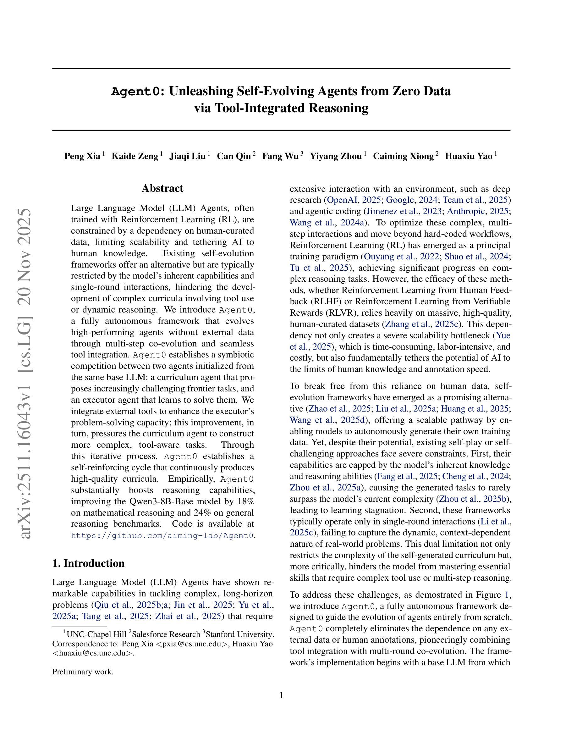 Large Language Model (LLM) Agents, often trained with Reinforcement Learning (RL), are constrained by a dependency on human-curated data, limiting scalability and tethering AI to human knowledge. Existing self-evolution frameworks offer an alternative but are typically restricted by the model’s inherent capabilities and single-round interactions, hindering the development of complex curricula involving tool use or dynamic reasoning. We introduce Agent0, a fully autonomous framework that evolves high-performing agents without external data through multi-step co-evolution and seamless tool integration. Agent0 establishes a symbiotic competition between two agents initialized from the same base LLM: a curriculum agent that proposes increasingly challenging frontier tasks, and an executor agent that learns to solve them. We integrate external tools to enhance the executor’s problem-solving capacity; this improvement, in turn, pressures the curriculum agent to construct more complex, tool-aware tasks. Through this iterative process, Agent0 establishes a self-reinforcing cycle that continuously produces high-quality curricula. Empirically, Agent0 substantially boosts reasoning capabilities, improving the Qwen3-8B-Base model by 18% on mathematical reasoning and 24% on general reasoning benchmarks. Code is available at https://github.com/aiming-lab/Agent0.