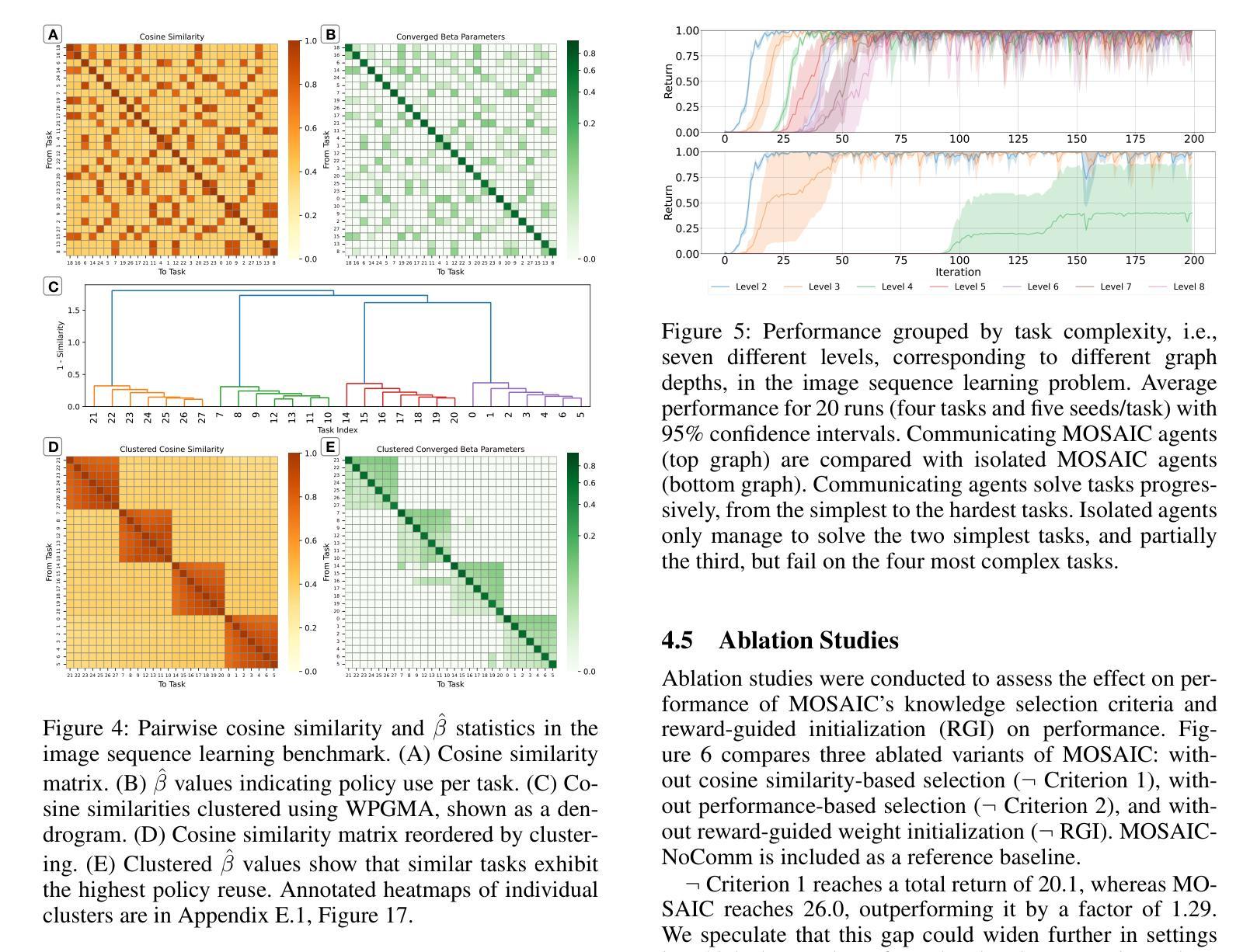 - MOSAIC算法通过性能信号和余弦相似性进行知识选择,利用模块化和可转移的神经表征来实现策略集成。