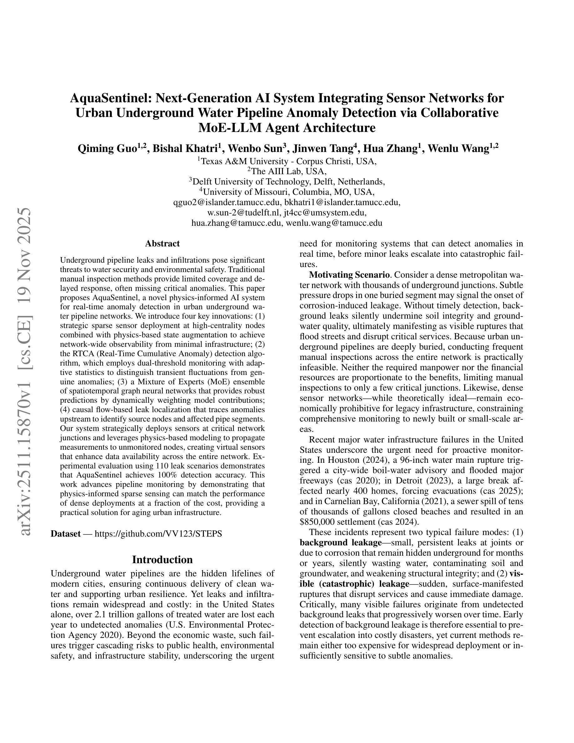 地下管道泄漏和渗透对供水安全和环境保护构成严重威胁。传统的手动检测方法覆盖有限且响应延迟,经常漏检重要异常。本文提出AquaSentinel,一种基于物理知识的AI系统,用于城市地下水管网实时异常检测。通过四项创新技术实现高效检测:在关键节点进行战略性稀疏传感器部署,结合基于物理的状态增强实现全网观测的最小化基础设施;RTCA(实时累积异常)检测算法,采用双阈值监测和自适应统计来区分瞬态波动和真实异常;基于时空图神经网络的混合专家集合,通过动态加权模型贡献提供稳健预测;基于因果流的泄漏定位,追溯异常上游以识别源节点和受影响管道段。实验评估显示,AquaSentinel在110个泄漏场景中实现100%的检测准确率。