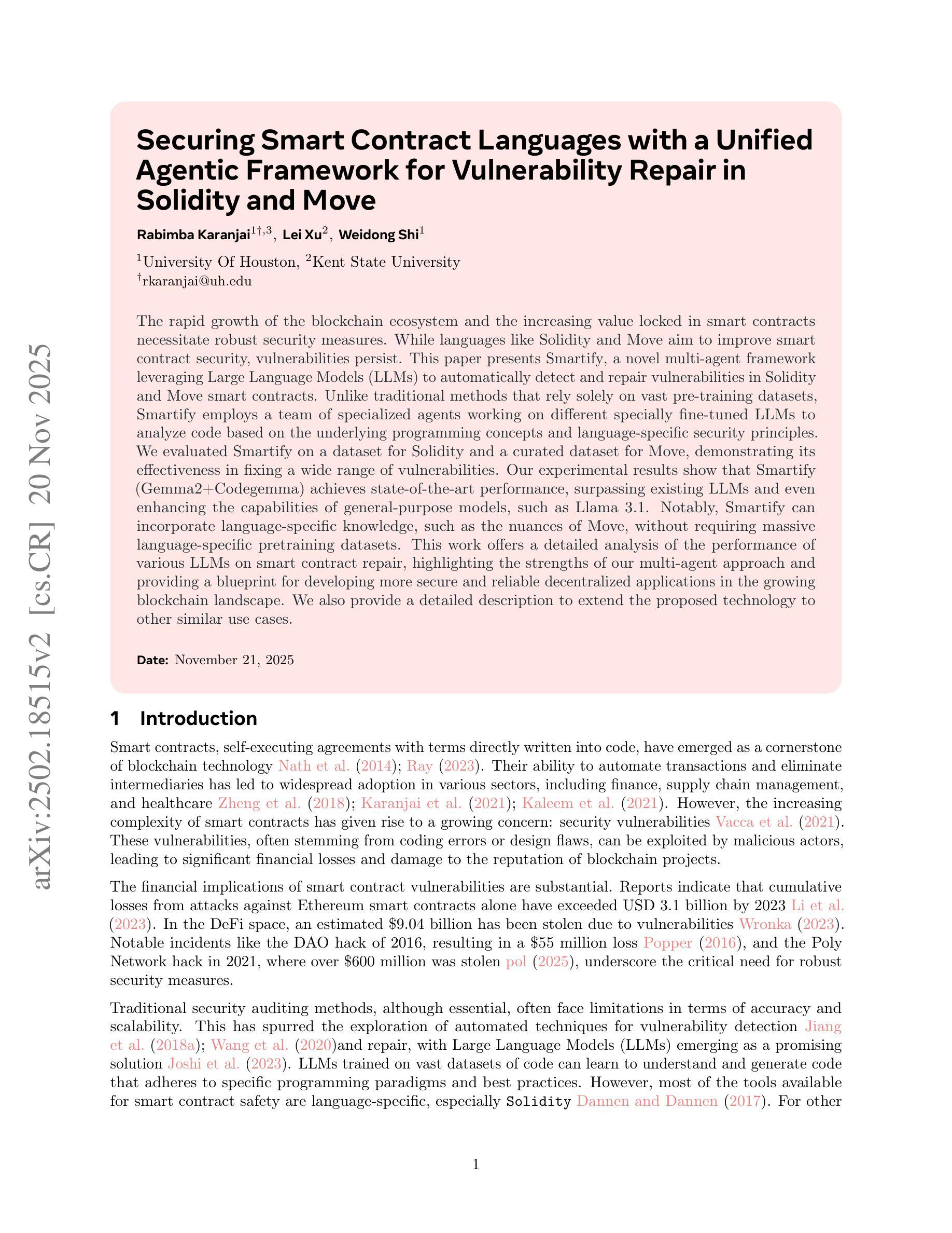 - Smartify是一个利用大型语言模型(LLM)的多智能合约框架,旨在自动检测和修复Solidity和Move智能合约中的漏洞。