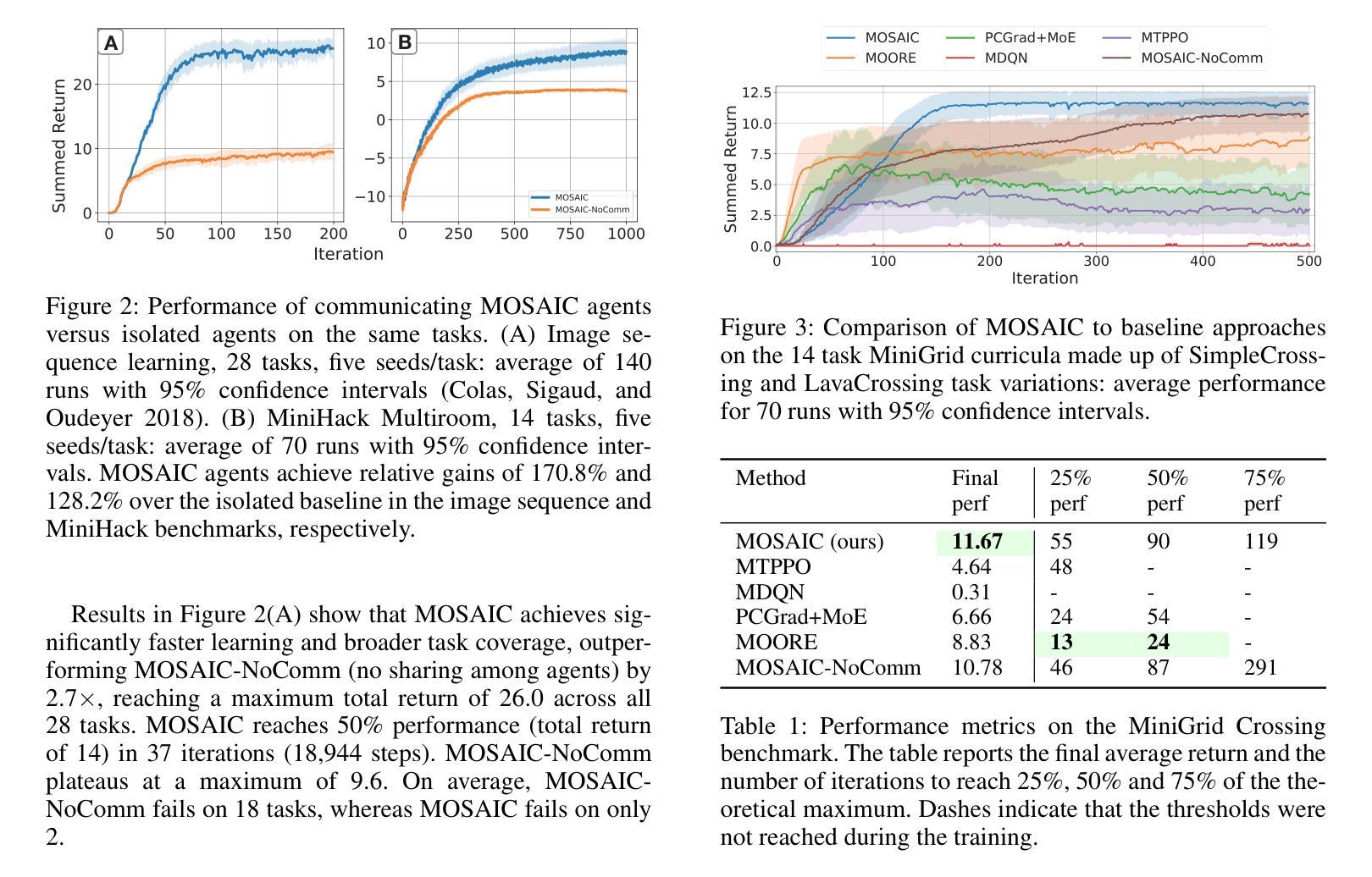- MOSAIC在学习速度和整体性能上超越了孤立学习者和全局共享方法。
