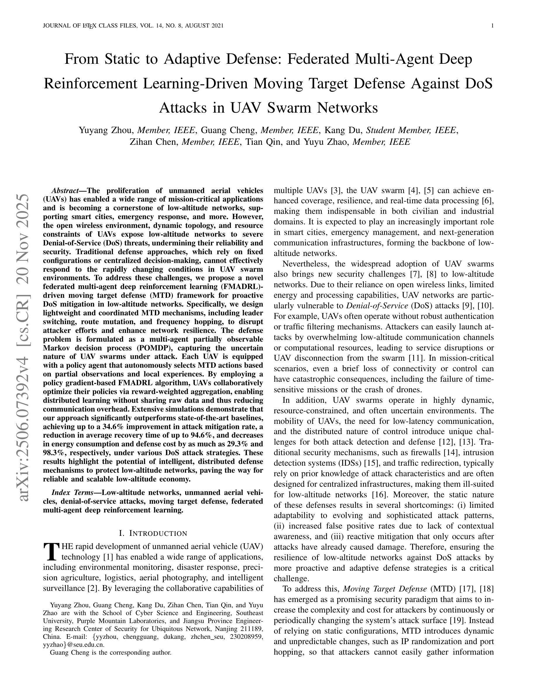 该文本介绍了无人机(UAVs)的普及及其在低空网络中的重要作用,但同时也面临着严重的拒绝服务(DoS)威胁。针对这些挑战,提出了一种基于联邦多智能体深度强化学习(FMADRL)的移动目标防御(MTD)框架,用于主动缓解低空网络中的DoS攻击。通过设计轻量级、协调性的MTD机制,包括领导者切换、路线突变和频率跳变等,以增强网络韧性和干扰攻击者。模拟实验表明,该方法显著优于现有基线,在各种DoS攻击策略下,攻击缓解率提高34.6%,平均恢复时间减少94.6%,能源消费和防御成本分别降低29.3%和98.3%。
