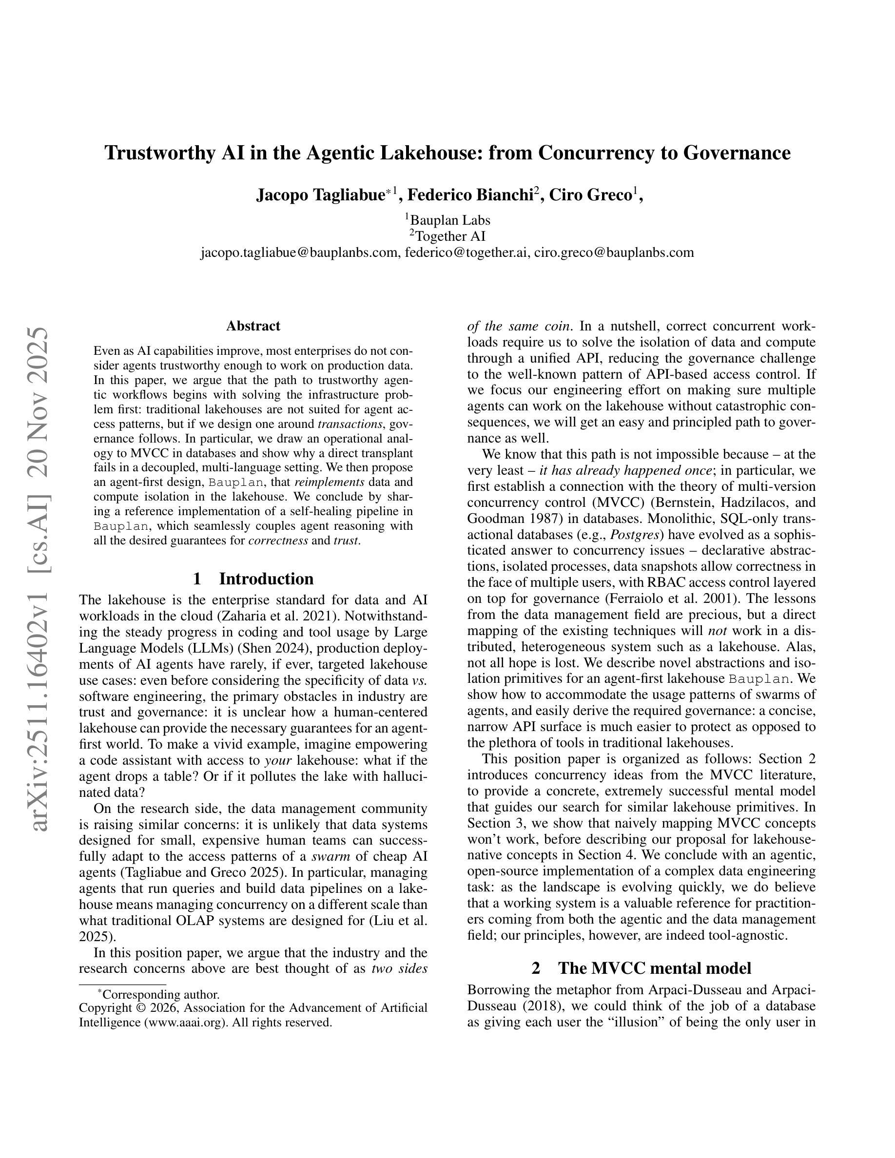 随着AI能力的不断提升,大多数企业仍认为智能体尚不足以处理生产数据。本文主张,实现可信赖的智能体工作流程,首先需解决基础设施问题:传统数据湖不适合智能体的访问模式,但如果以事务为中心进行设计,治理便会应运而生。我们特别通过操作类比数据库中的MVCC,并展示了在解耦的多语言环境中直接移植为什么会失败。然后,我们提出了一种以智能体为中心的设计——Bauplan,重新实现了数据湖中的数据和计算隔离。最后,我们分享了在Bauplan中的自修复管道的参考实现,该管道无缝地将智能体推理与所有所需的正确性和信任保证结合在一起。