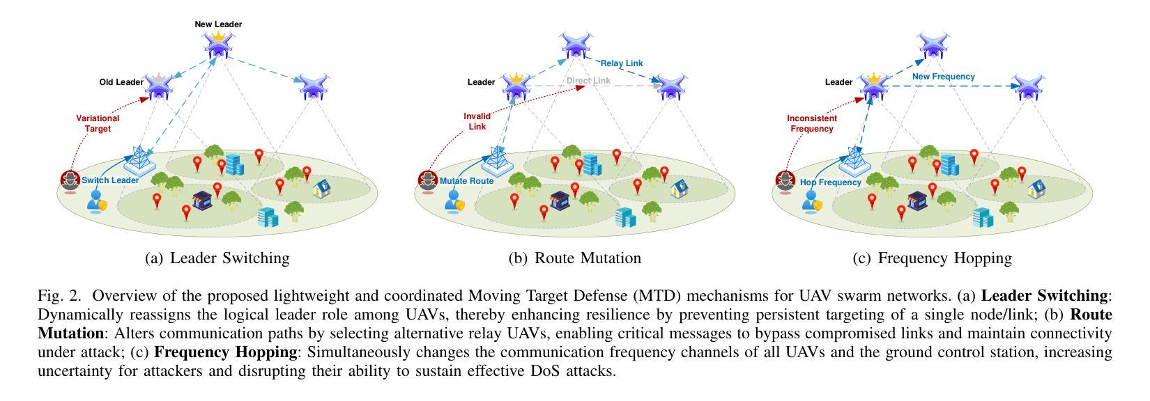 - MTD机制包括领导者切换、路线突变和频率跳变,旨在干扰攻击者并增强网络韧性。