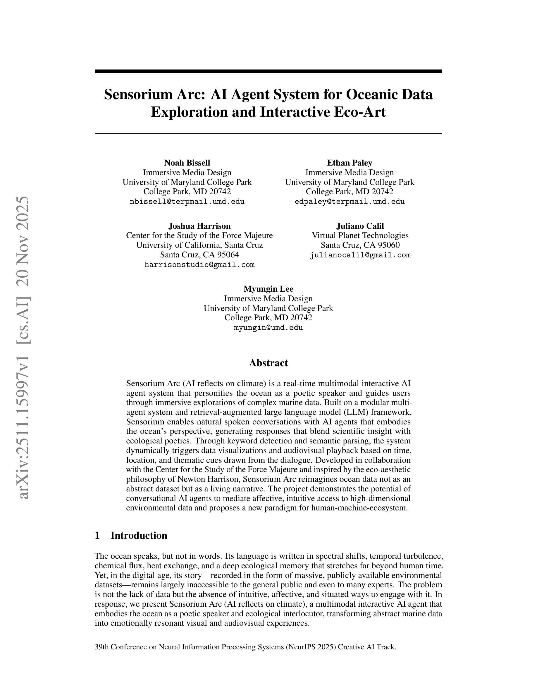 Sensorium Arc (AI reflects on climate) is a real-time multimodal interactive AI agent system that personifies the ocean as a poetic speaker and guides users through immersive explorations of complex marine data. Built on a modular multi-agent system and retrieval-augmented large language model (LLM) framework, Sensorium enables natural spoken conversations with AI agents that embodies the ocean’s perspective, generating responses that blend scientific insight with ecological poetics. Through keyword detection and semantic parsing, the system dynamically triggers data visualizations and audiovisual playback based on time, location, and thematic cues drawn from the dialogue. Developed in collaboration with the Center for the Study of the Force Majeure and inspired by the eco-aesthetic philosophy of Newton Harrison, Sensorium Arc reimagines ocean data not as an abstract dataset but as a living narrative. The project demonstrates the potential of conversational AI agents to mediate affective, intuitive access to high-dimensional environmental data and proposes a new paradigm for human-machine-ecosystem.