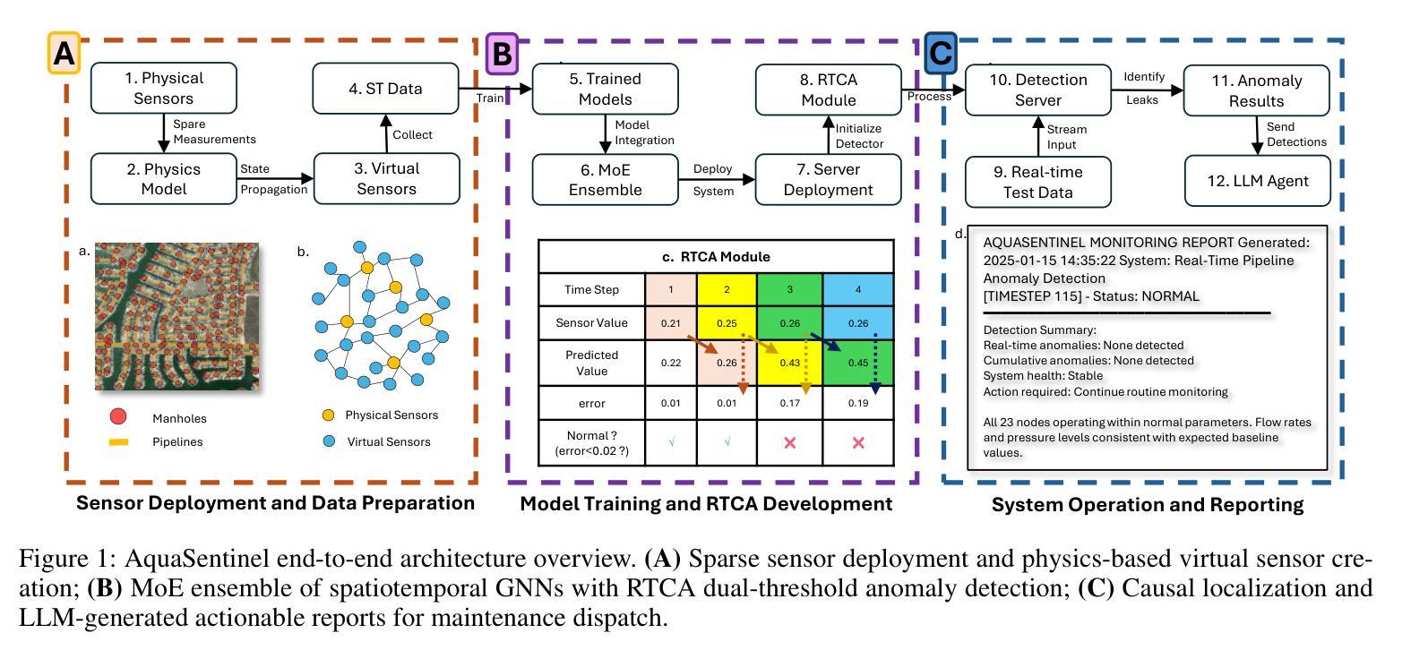 地下管道泄漏和渗水对供水安全和环保构成严重威胁。传统的手动检测方法覆盖有限,响应延迟,经常会错过关键异常。本文提出AquaSentinel,一种用于城市地下水管网实时异常检测的新型物理信息人工智能系统。我们介绍了四项关键创新:(1)在高中心节点进行战略性稀疏传感器部署,结合基于物理的状态增强,以在最少基础设施的情况下实现全网观测;(2)RTCA(实时累积异常)检测算法,采用双阈值监控和自适应统计,以区分瞬时波动和真正的异常;(3)时空图神经网络的专家混合(MoE)集合,通过动态加权模型贡献提供稳健预测;(4)基于因果流的泄漏定位,跟踪异常上游以识别源节点和受影响的管道段。我们的系统会在关键网络节点进行战略性传感器部署,并利用基于物理的建模将测量值传播到未监测的节点,创建虚拟传感器,提高整个网络的数据可用性。使用110个泄漏场景进行的实验评估表明,AquaSentinel检测准确率为100%。这项工作通过展示物理信息稀疏传感可以匹配密集部署的性能且成本更低,为解决老化的城市基础设施提供了实用解决方案。