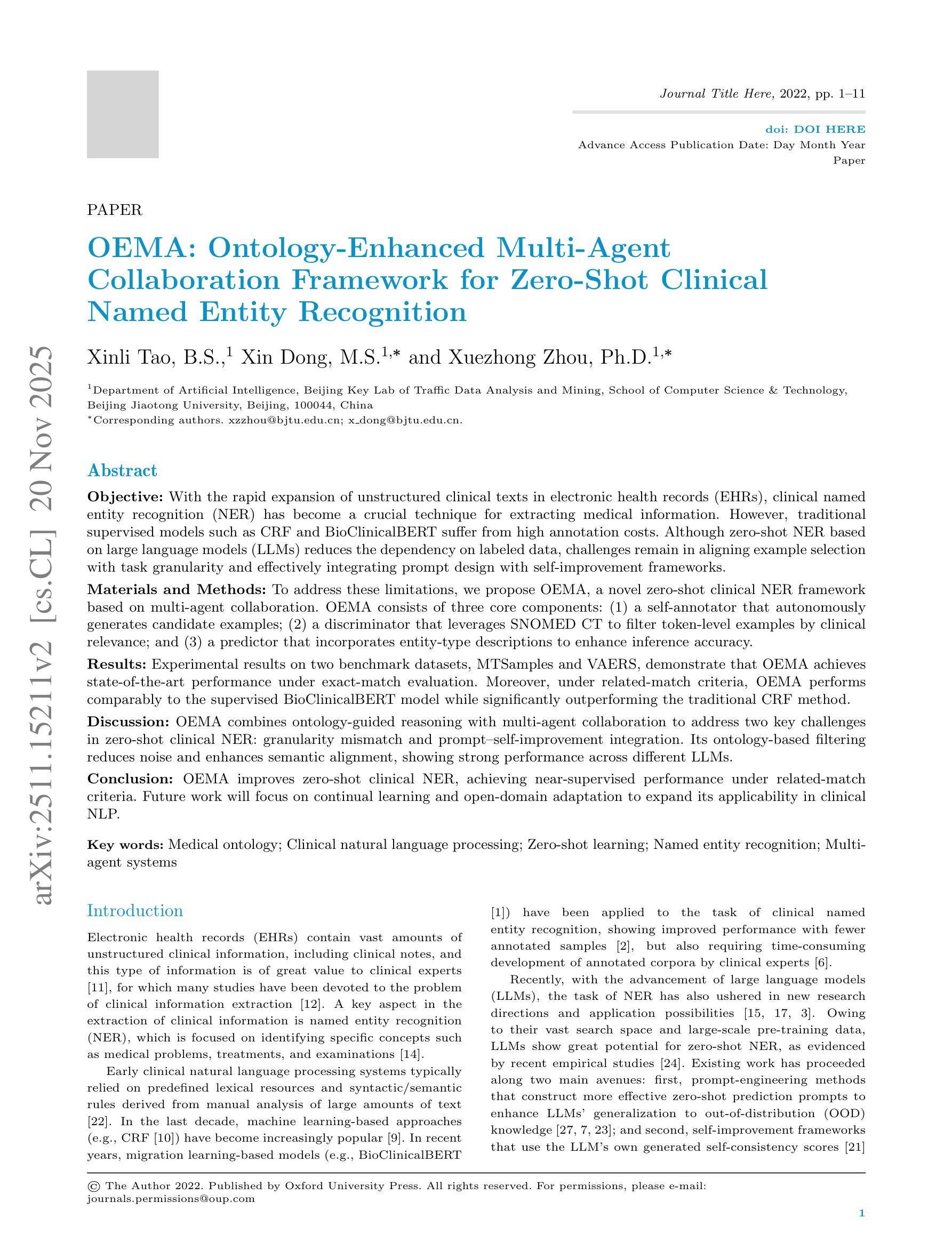 随着电子健康记录(EHRs)中无结构临床文本的快速扩展,临床命名实体识别(NER)已成为提取医疗信息的关键技术。然而,CRF和BioClinicalBERT等传统监督模型面临着高标注成本的问题。尽管基于大型语言模型(LLM)的零样本NER降低了对标记数据的依赖,但在示例选择与任务粒度对齐以及提示设计与自我改进框架的有效集成方面仍存在挑战。为了解决这些局限性,我们提出了基于多智能体协作的OEMA新型零样本临床NER框架。OEMA由三个核心组件组成:(1)自主生成候选示例的自我注释器;(2)利用SNOMED CT过滤掉与临床不相关标记的鉴别器;(3)结合实体类型描述以提高推理准确度的预测器。在MTSamples和VAERS两个基准数据集上的实验结果表明,OEMA在精确匹配评估下达到了最先进的性能。此外,在相关匹配标准下,OEMA的表现与监督学习模型BioClinicalBERT相当,而明显优于传统的CRF方法。OEMA提高了零样本临床NER的性能,在相关匹配标准下实现了接近监督学习的表现。未来的工作将专注于持续学习和开放域适应,以扩大其在临床自然语言处理中的应用范围。