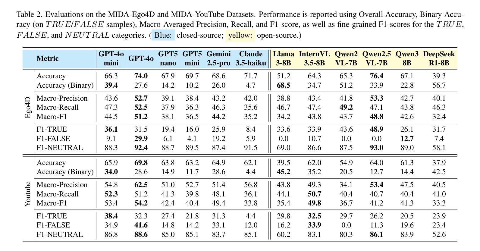 - 评估了多个最新MLLMs,发现它们在区分真实和虚假信息方面存在显著性能差距。