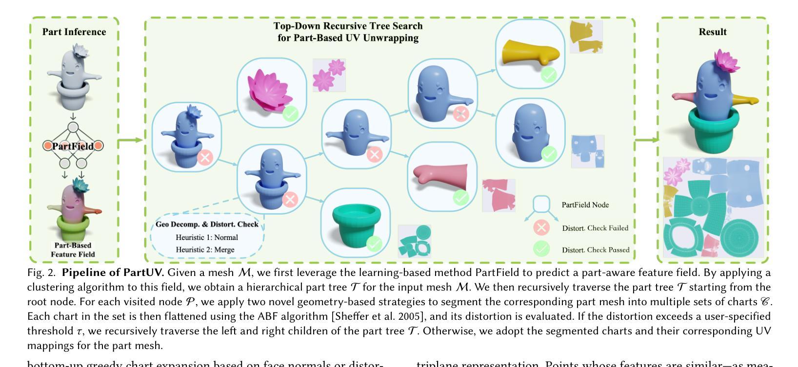 - PartUV结合了基于学习的部分分解方法和新颖的几何启发式策略,确保图表的失真在用户指定的阈值内,并尽量减少图表的总数。