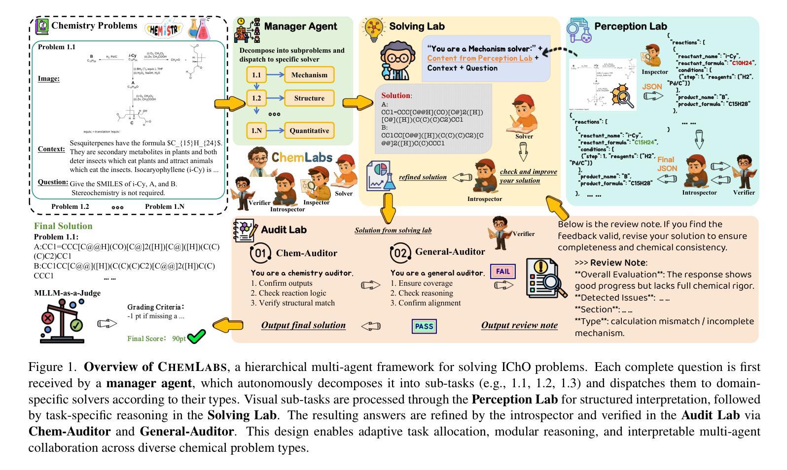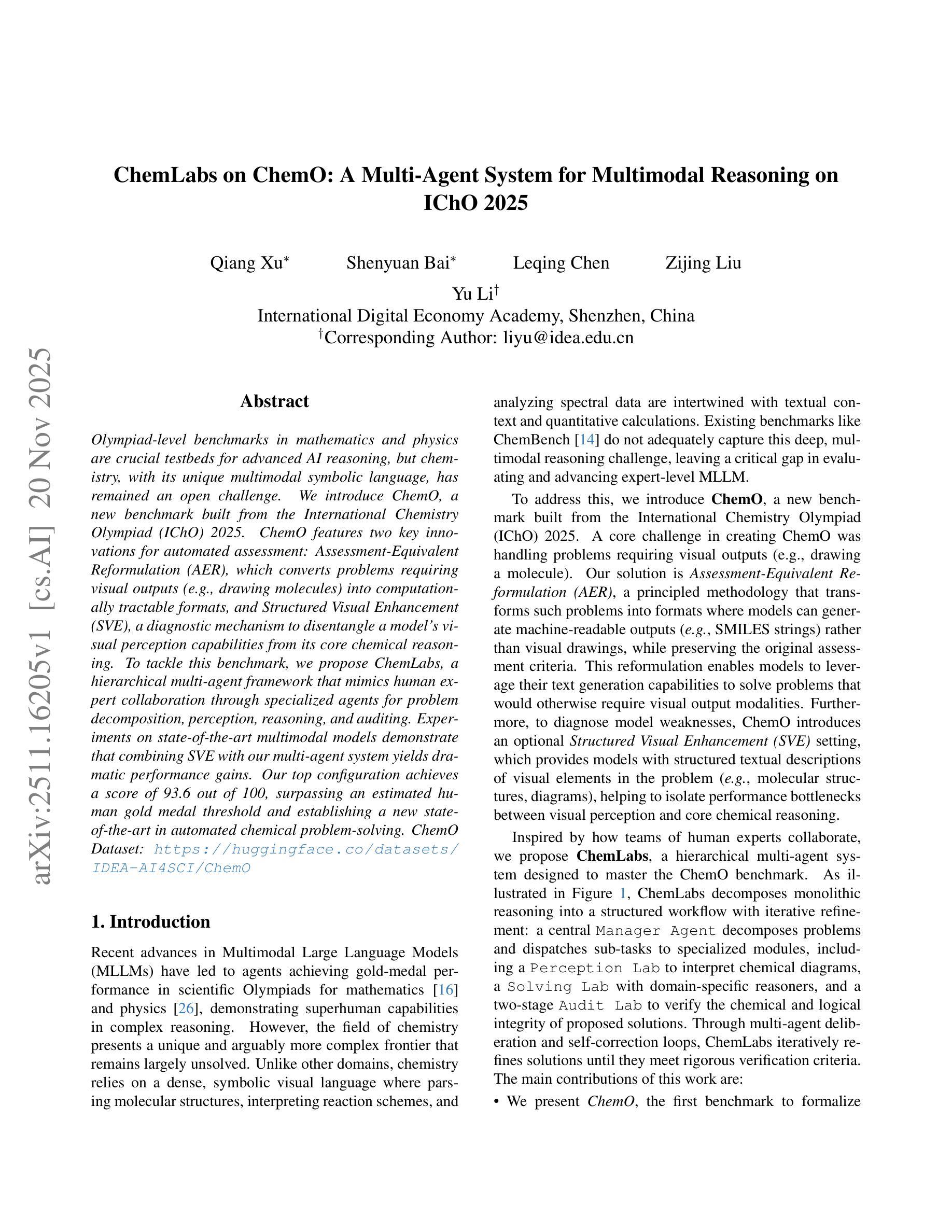 在数学和物理的奥林匹克级别的基准测试中,它们是测试先进AI推理能力的关键平台,然而化学凭借其独特的多模式符号语言,仍然是一个开放性的挑战。我们引入了ChemO,这是一个新的基准测试,源自2025年国际化学奥林匹克竞赛(IChO)。ChemO为自动化评估提供了两个关键创新点:评估等效重构(AER),它将需要视觉输出(例如绘制分子)的问题转换为计算上可行的格式;以及结构化视觉增强(SVE),这是一种诊断机制,用于区分模型的视觉感知能力与其核心化学推理能力。为了应对这一基准测试,我们提出了ChemLabs,这是一个分层的多智能体框架,通过专门智能体进行问题分解、感知、推理和审计,从而模仿人类专家的协作。在最新多模式模型上的实验表明,将SVE与我们的多智能体系统相结合,可以产生显著的性能提升。我们的顶级配置得分93.6分(满分100分),超过了估计的人类金牌门槛,在自动化化学问题解决方面建立了新的最新技术。ChemO数据集地址:https://huggingface.co/datasets/IDEA-AI4SCI/ChemO