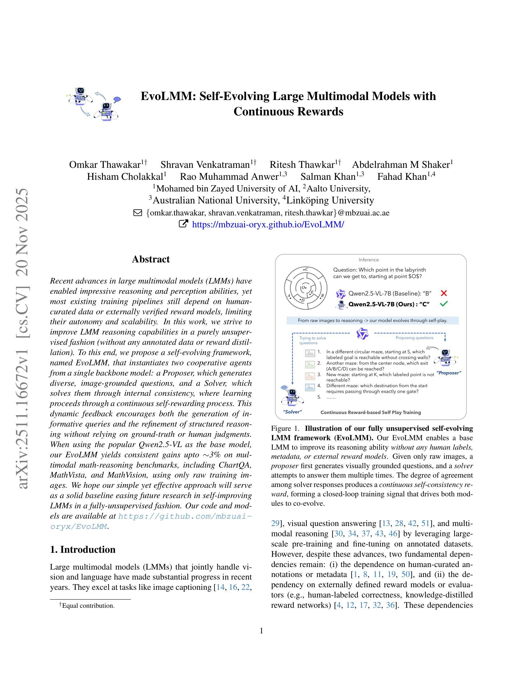 近期大型多模态模型(LMM)的进展赋予了令人印象深刻的推理和感知能力,然而,大多数现有的训练管道仍然依赖于人工编制的数据或外部验证的奖励模型,这限制了其自主性和可扩展性。在这项工作中,我们致力于以完全无监督的方式(无需任何注释数据或奖励蒸馏)提高LMM的推理能力。为此,我们提出了一种名为EvoLMM的自我进化框架,它从一个单一的主干模型中实例化两个协作代理:一个提议者,用于生成多样化、基于图像的问题,一个求解器,通过内部一致性解决这些问题,学习通过持续的自我奖励过程进行。这种动态反馈鼓励生成信息丰富的查询和精细的结构化推理,无需依赖真实数据或人类判断。当使用流行的Qwen2.5-VL作为基础模型时,我们的EvoLMM在多模态数学推理基准测试上产生了持续的增益,在ChartQA、MathVista和MathVision上的准确率提高了约3%,且仅使用原始训练图像。我们希望这种简单而有效的方法将成为在无监督环境中自我改进LMM的坚实基线,为未来研究铺平道路。我们的代码和模型可在https://github.com/mbzuai-oryx/EvoLMM获得。