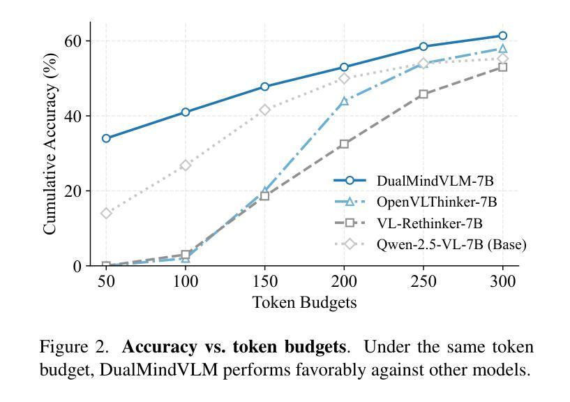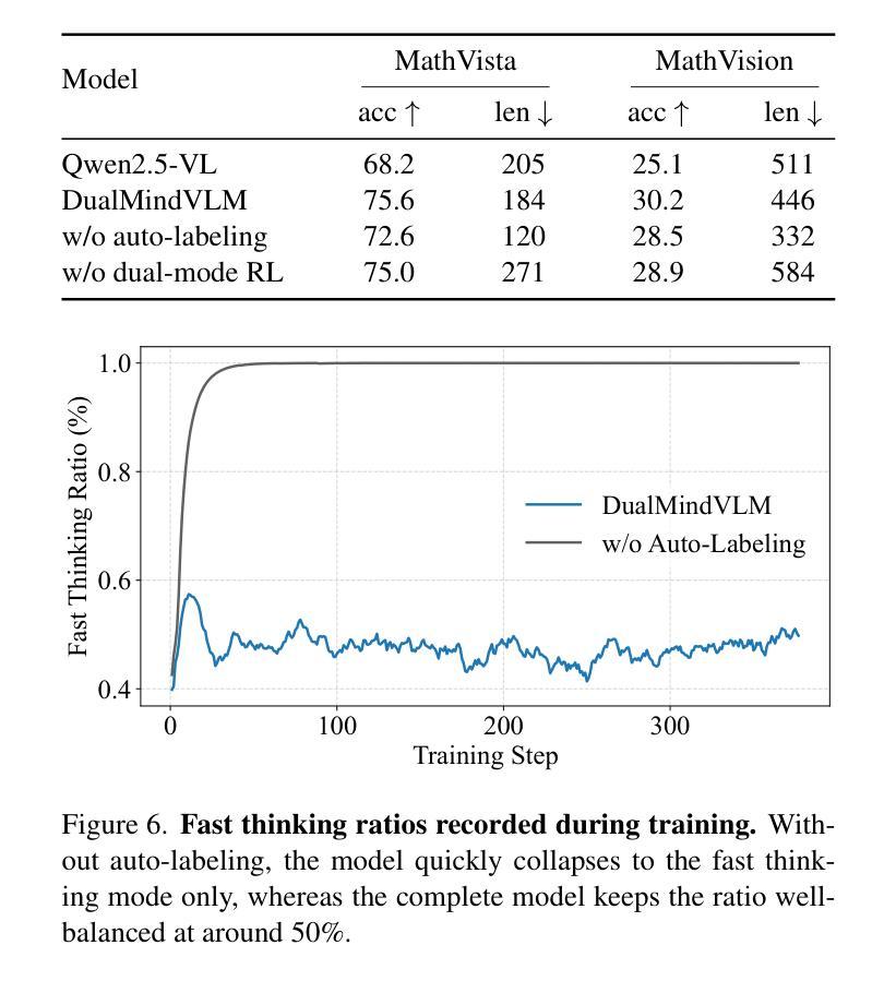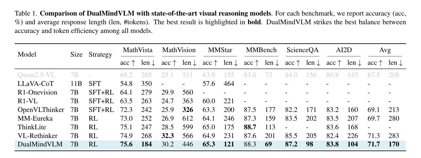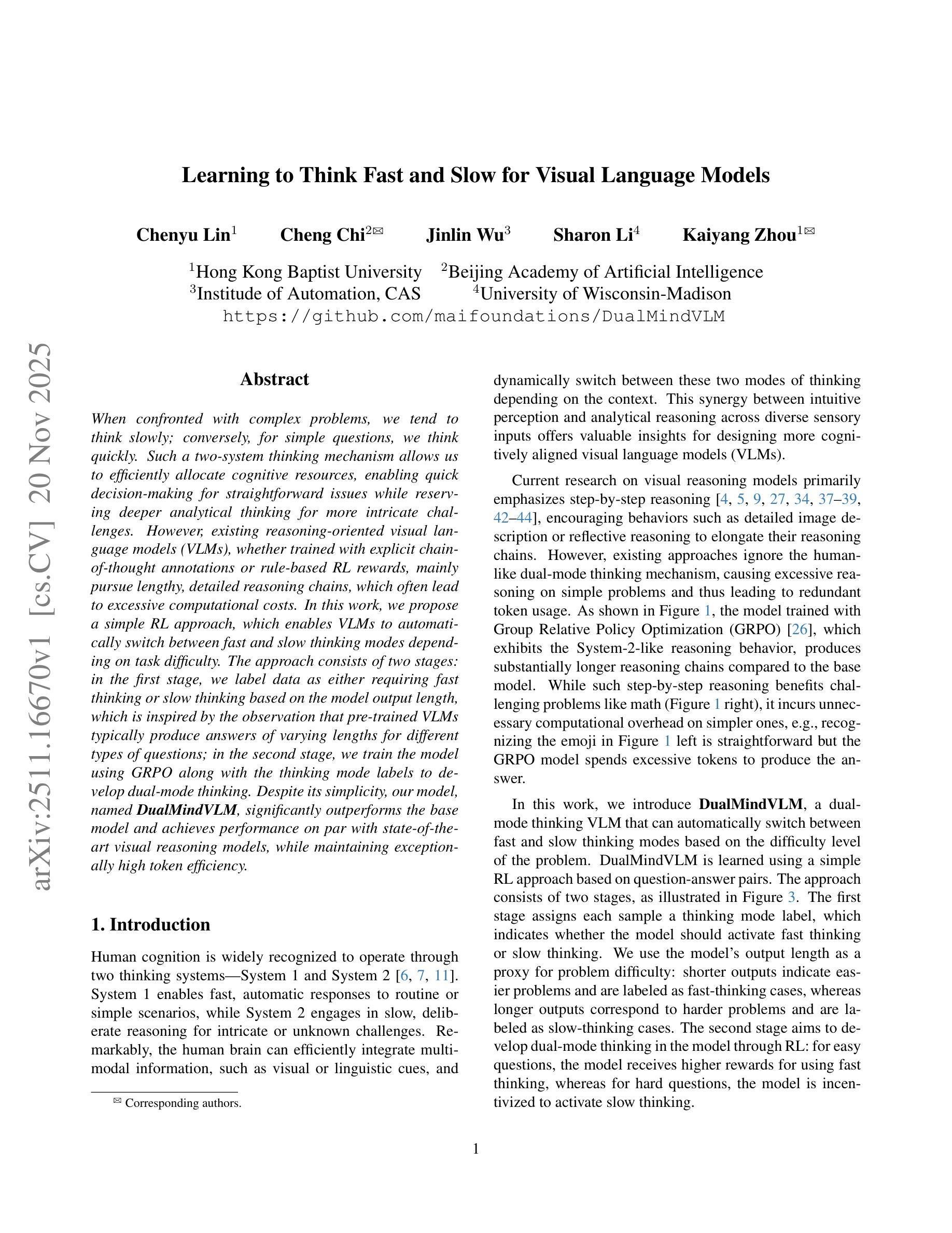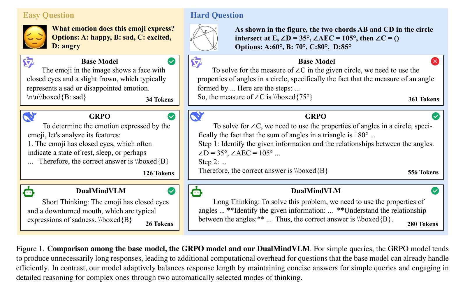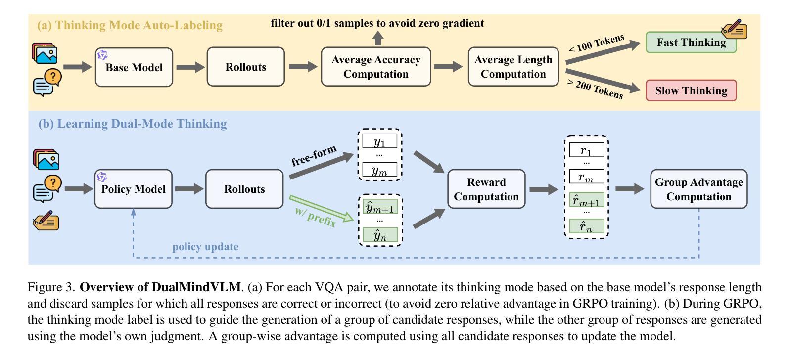 当面对复杂问题时,我们往往思考得较慢;相反,对于简单问题,我们则思考得较快。这种双系统思考机制使我们能够高效地分配认知资源,对简单直接的问题快速做出决策,同时保留深度分析思考以应对更复杂的挑战。然而,现有的以推理为导向的视觉语言模型(VLMs),无论是以明确的思维链注释进行训练还是以基于规则的RL奖励进行训练,主要追求的是冗长详细的推理链,这往往导致过高的计算成本。在这项工作中,我们提出了一种简单的RL方法,使VLMs能够根据任务难度自动切换快速和慢速思考模式。该方法分为两个阶段:在第一个阶段,我们根据模型输出长度来标注数据,需要快速思考还是慢速思考,这是受到以下观察的启发——预训练的VLMs通常针对不同的类型问题会产生不同长度的答案;在第二个阶段,我们使用GRPO和思维模式标签来训练模型,以发展双模式思维。尽管我们的模型DualMindVLM非常简单,但它显著优于基础模型,实现了与最新视觉推理模型相当的性能,同时保持了极高的令牌效率。