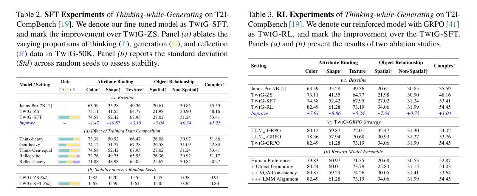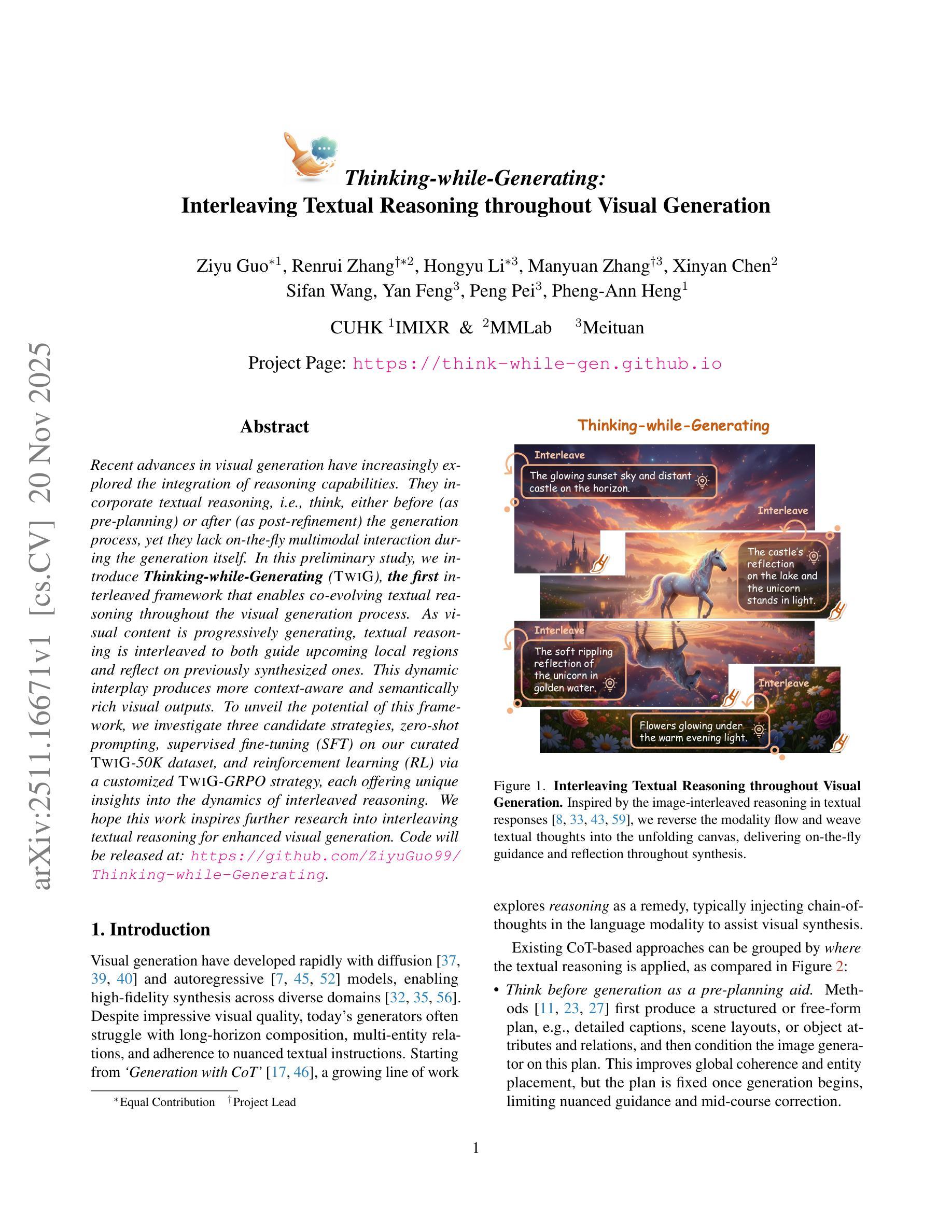 近期视觉生成技术的进展越来越注重探索融合推理能力。它们融入了文本推理,即在生成过程之前(作为预先规划)或之后(作为后期优化)进行思考,但在生成过程中缺乏即时多模式交互。在这项初步研究中,我们引入了“思考生成”(Thinking-while-Generating,TwiG)的概念,这是第一个交错框架,能够在视觉生成过程中实现协同演化的文本推理。随着视觉内容的逐步生成,文本推理被交织在一起,既引导即将到来的局部区域,又对先前合成的区域进行反思。这种动态交互产生了更具上下文意识和语义丰富的视觉输出。为了揭示该框架的潜力,我们研究了三种候选策略,包括零样本提示、在我们精选的TwiG-50K数据集上进行监督微调(SFT),以及通过定制的TwiG-GRPO策略进行强化学习(RL),每种策略都为交错推理的动力学提供了独特的见解。我们希望这项工作能激发对融合文本推理以改进视觉生成的进一步研究。代码将在以下网址发布:https://github.com/ZiyuGuo99/Thinking-while-Generating。