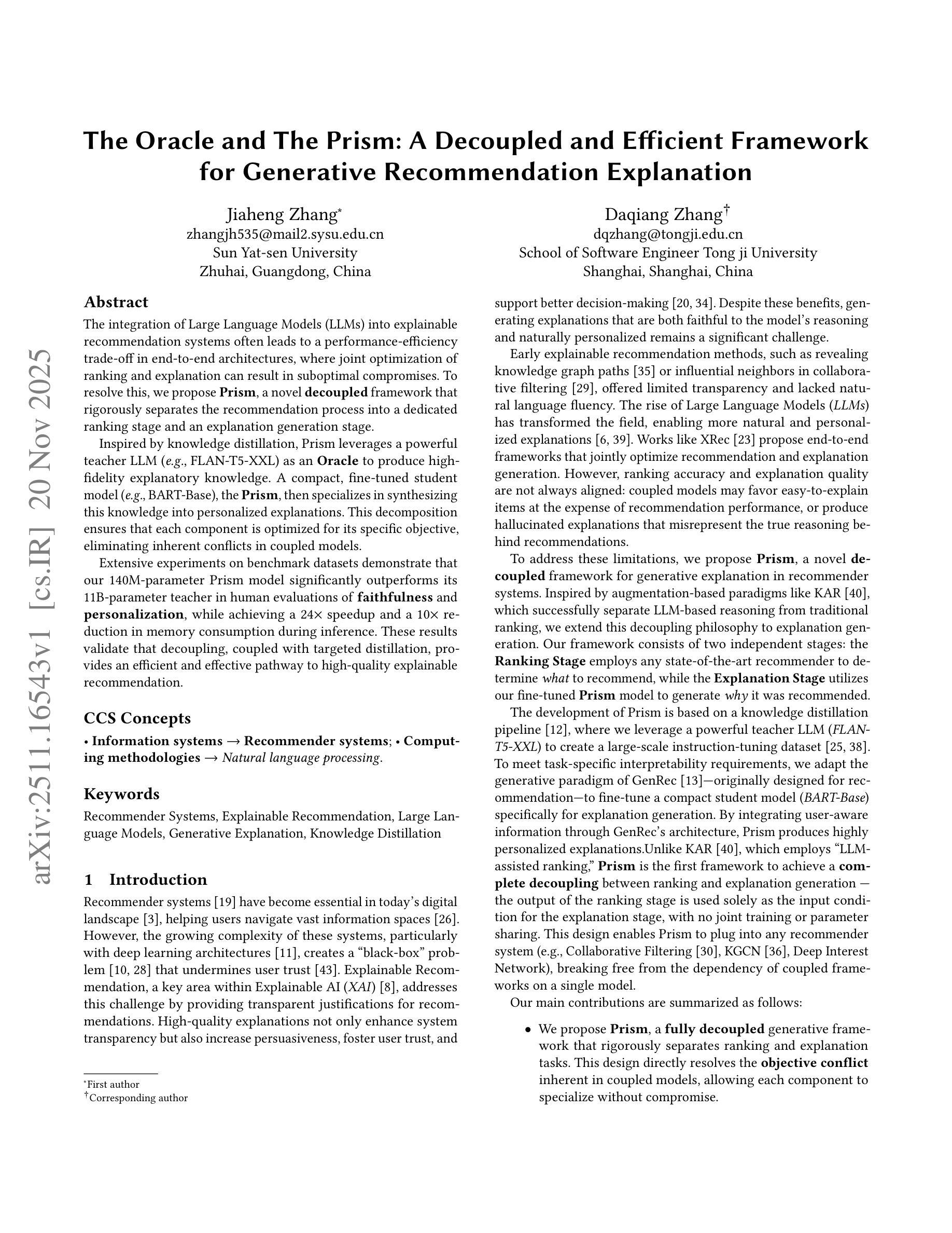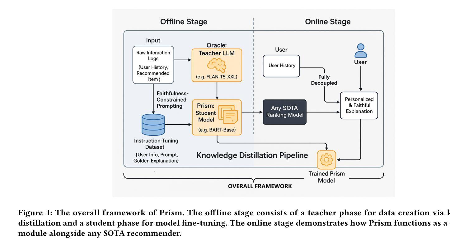 大型语言模型(LLMs)融入可解释推荐系统时,在端到端架构中常面临性能与效率的权衡问题。为解决此问题,我们提出一种名为Prism的新型解耦框架,将推荐过程严格划分为专门的排名阶段和解释生成阶段。受知识蒸馏的启发,Prism利用强大的教师LLM(如FLAN-T5-XXL)作为Oracle产生高保真解释知识。然后,一个紧凑、经过微调的学生模型(即Prism,如BART-Base)专门负责将这些知识合成个性化的解释。这种分解确保每个组件都能针对其特定目标进行优化,消除了耦合模型中的固有冲突。在基准数据集上的大量实验表明,我们的1.4亿参数Prism模型在人类对忠诚度和个性化的评价中显著优于其11亿参数的老师,同时在推理过程中实现了24倍的速度提升和10倍的内存消耗减少。这些结果证明,结合有针对性的蒸馏进行解耦,是通往高质量可解释推荐的有效途径。