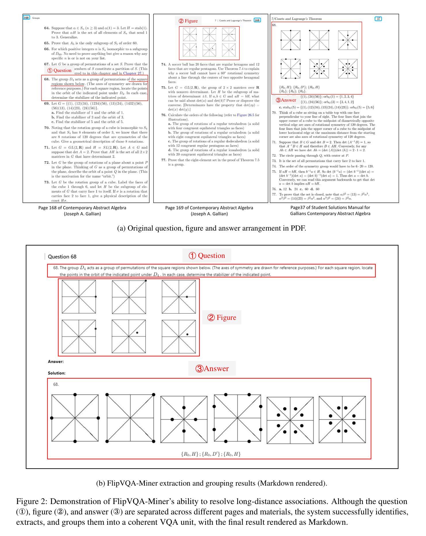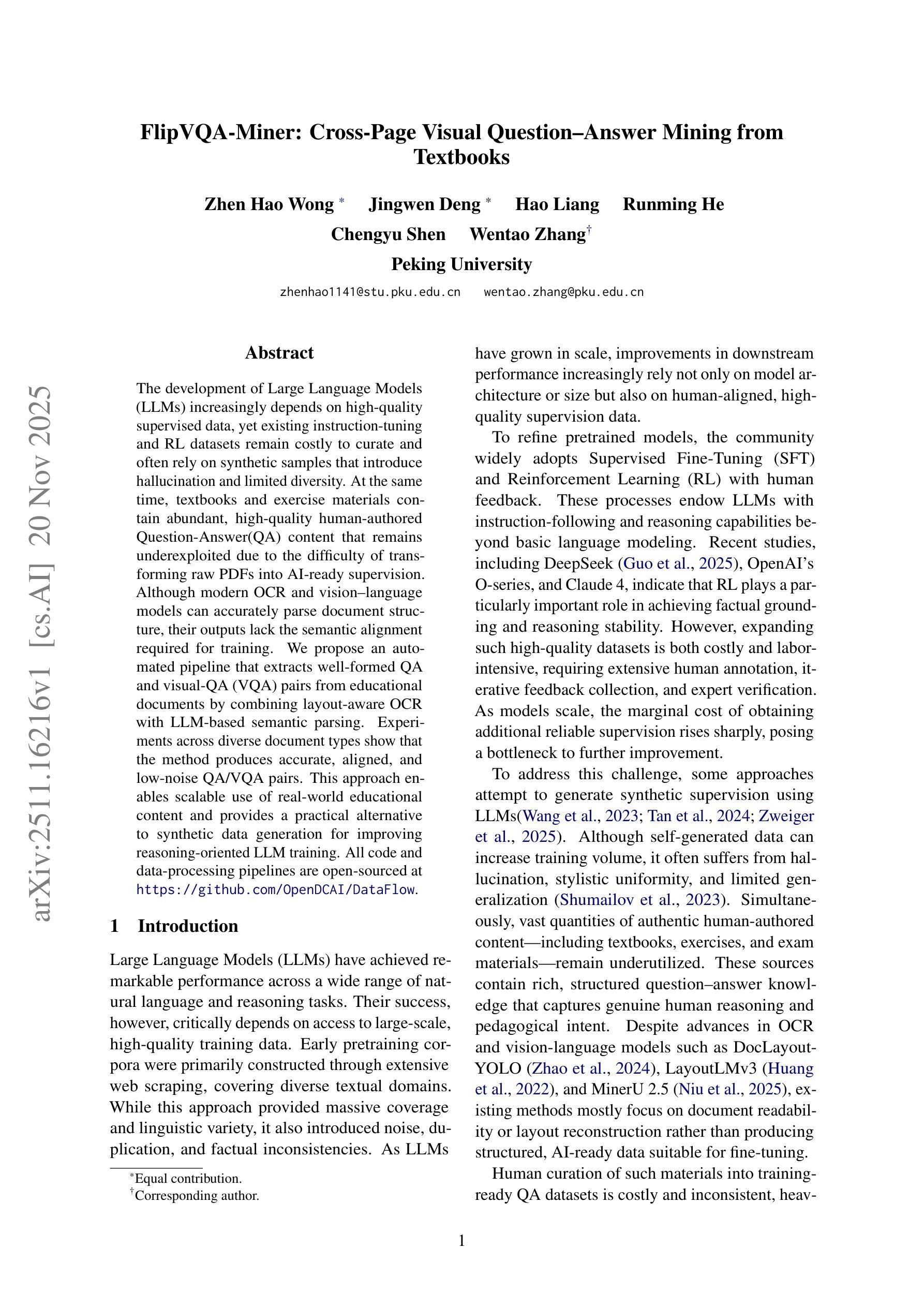 从文本中可以看出,当前大型语言模型(LLMs)的发展越来越依赖于高质量的有监督数据。然而,现有的指令调整和强化学习数据集仍然成本高昂,且常常依赖于合成样本,这导致了引入虚构和有限的多样性问题。同时,教科书和练习材料中含有丰富的高质量人类创作的问题答案(QA)内容,但由于将原始PDF转换为AI可用监督数据的难度,这些内容尚未得到充分利用。尽管现代OCR和视觉语言模型可以准确地解析文档结构,但其输出缺乏语义对齐,无法用于训练。因此,本文提出了一种自动化管道,通过结合基于布局的OCR和LLM语义解析,从教育文档中提取形成良好的QA和视觉问答(VQA)对。实验证明,该方法生成的QA/VQA对准确、对齐且噪声低。这种方法使得现实世界的教育内容得以规模化使用,并为改善基于推理的LLM训练提供了实用的替代方案。