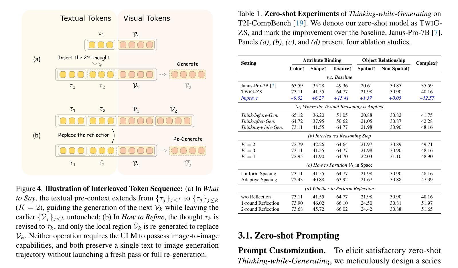 - Thinking-while-Generating(TwiG)框架允许在视觉生成过程中融入文本推理能力。