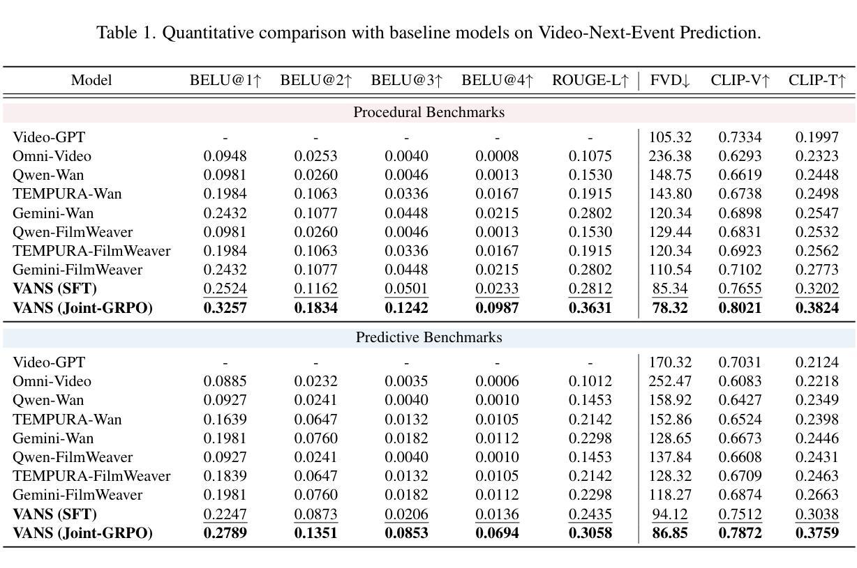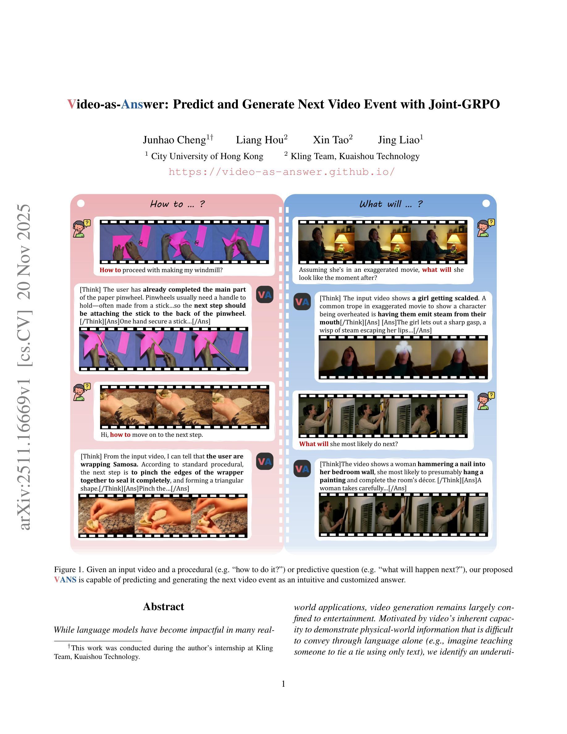 虽然语言模型在许多实际应用中产生了巨大影响,但视频生成仍然主要局限于娱乐。受到视频固有能力的启发,即展示难以仅通过语言传达的实体世界信息(例如,想象只用文字教别人打领带),我们发现了被忽视的机会,将视频扩展为一种新的答案形式——下一代事件预测(NEP),正式定义为视频下一代事件预测(VNEP)。现有的NEP任务接受包含过程或预测问题的视频作为输入来预测文本中的下一个事件,而VNEP则需要动态的视频响应。这种从讲述到展示的转变为过程学习和创造性探索提供了更直观和定制化的答案。然而,此任务对于现有模型来说仍然具有挑战性,因为它需要理解多模式输入、指令条件推理,以及生成具有视觉和语义一致性的视频。为了解决这个问题,我们引入了VANS模型,该模型利用强化学习将视觉语言模型(VLM)与视频扩散模型(VDM)对齐,用于VNEP。VANS的核心是我们提出的联合GRPO,它协调VLM和VDM作为一个单元进行工作。通过共享输出奖励来驱动,它优化VLM生成既准确又易于可视化的字幕,同时引导VDM生成的视频忠于这些字幕和输入视觉上下文。为了实现这一学习,我们精心制作了专门用于VNEP任务的VANS-Data-100K数据集。在过程和预测基准测试上的实验表明,VANS在视频事件预测和可视化方面都达到了最新技术水平。相关代码已发布在https://github.com/KlingTeam/VANS。